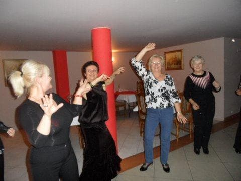 Dobre jedzenie i odrobina humoru, którą przygotowali Krystyna Dzięcioł z mężem oraz Maryla ,były przerywnikiem i okazją do złapania oddechu . Do zabawy włączyli się, bez większych oporów, uczestnicy spotkania. W tym miejscu chcemy wyrazić słowa wdzięczności dla p. Kasi Ulicz , która była bardzo pomocna przy organizacji imprezy. Ależ my umiemy się bawić! I ta gracja ruchów i ten wdzięk, i ta skoczność – w naszym wieku to niebywały sukces – tylko pozazdrościć. Żadnej zadyszki, zero zmęczenia ( no może trochę przesadziłam) i szczere chęci do każdorazowego wybiegu na parkiet. Chwalimy się same bo kto nas może dowartościować jak widzów było zbyt mało! Bez pochlebstwa – wiele zawdzięczamy ludziom, którzy rozpoczęli , rozbujali i prowadzą sekcje usprawniające nasze ciało i umysł. mpp
