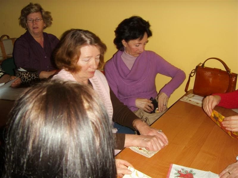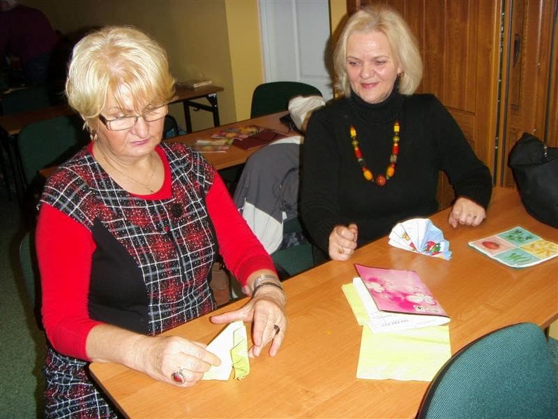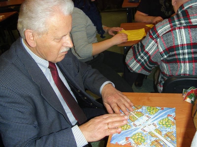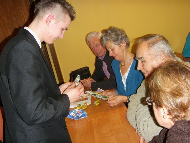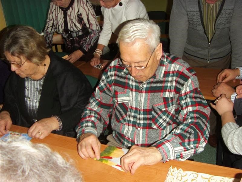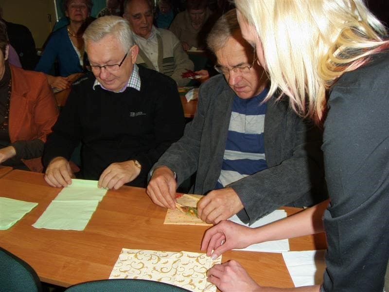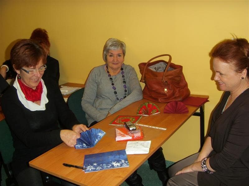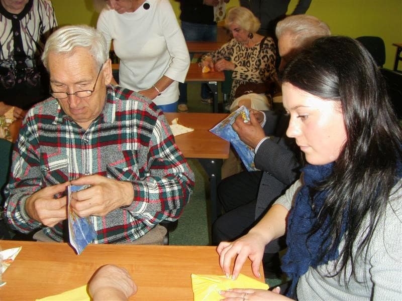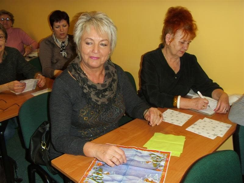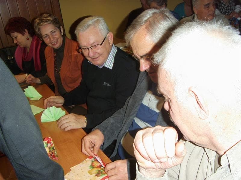 Młodzi ludzie, uczniowie ZSP Nr 3 z ul. Strzeleckiej: Maja Lebioda, Marta Marczewska, Bartek Besiński, Karolina Jakubczak oraz ich nauczycielka p. Maja Kisły ( wszyscy mogliby być naszymi wnukami), zaimponowali nam rozległą wiedzą na temat całej świątecznej otoczki, za sprawą której właśnie te święta mają swoją niepowtarzalną magię i są tak bardzo wyczekiwane przez dorosłych i dzieci. Każdy dom ma swoje potrawy, swój wigilijny rytuał, swoje ulubione kolędy. Jest jednak sporo rzeczy wspólnych – i właśnie na tym skupili się nasi młodzi wykładowcy. To nie tylko oczekiwanie na pierwszą gwiazdkę, łamanie się opłatkiem, składanie życzeń, choinka i prezenty, o czym niby wszyscy wiedzą ale, jak się okazało, warto to czasami przypomnieć. W tym dniu nawet stół musi mieć inną, piękniejszą niż zazwyczaj szatę. I my, uczyliśmy się z kolorowych serwetek wyczarowywać te cudeńka, dzięki którym świąteczny stół nabiera jeszcze pełniejszego blasku. Panowie też nieźle sobie radzili. Tekst i foto mpp