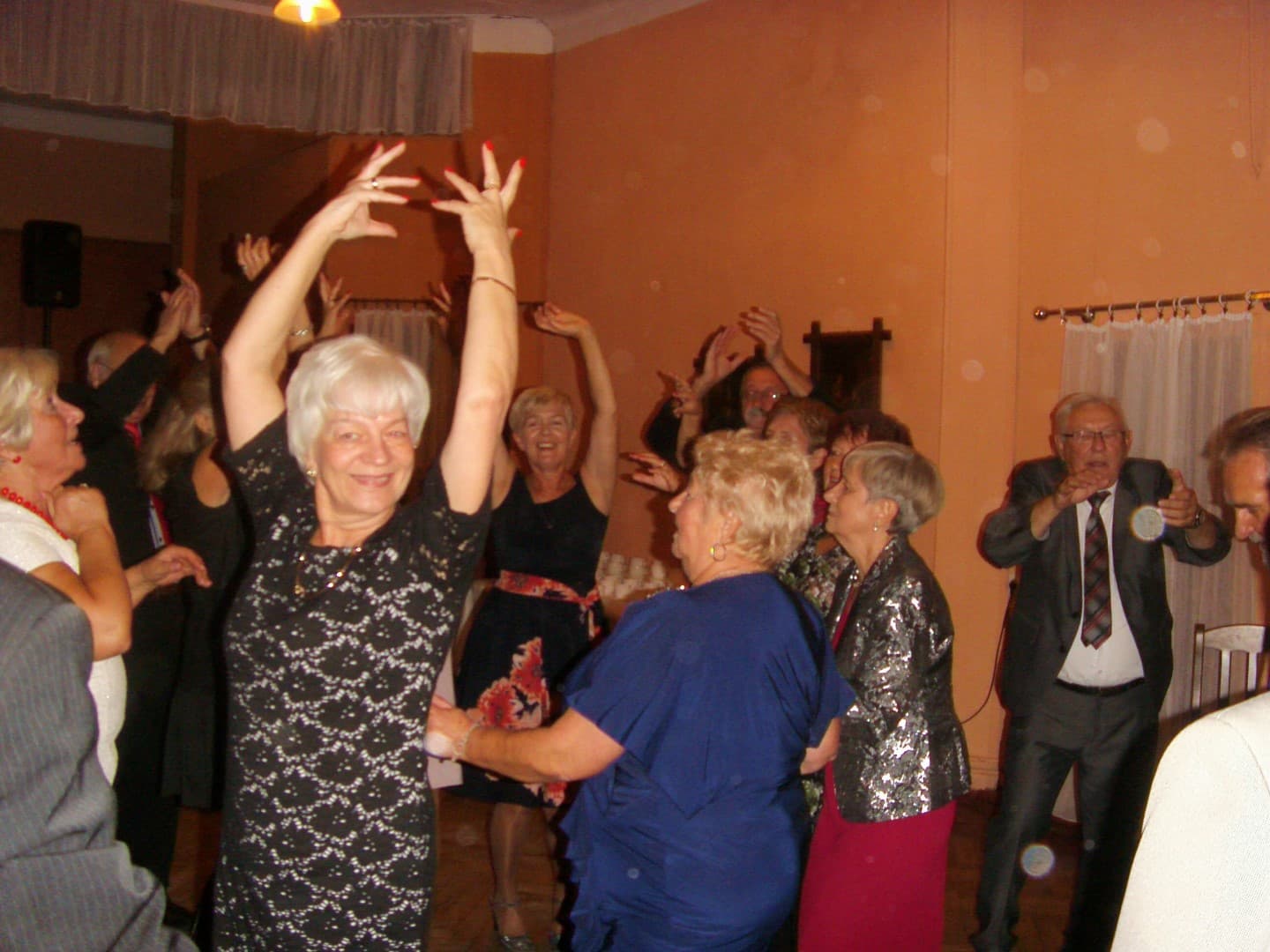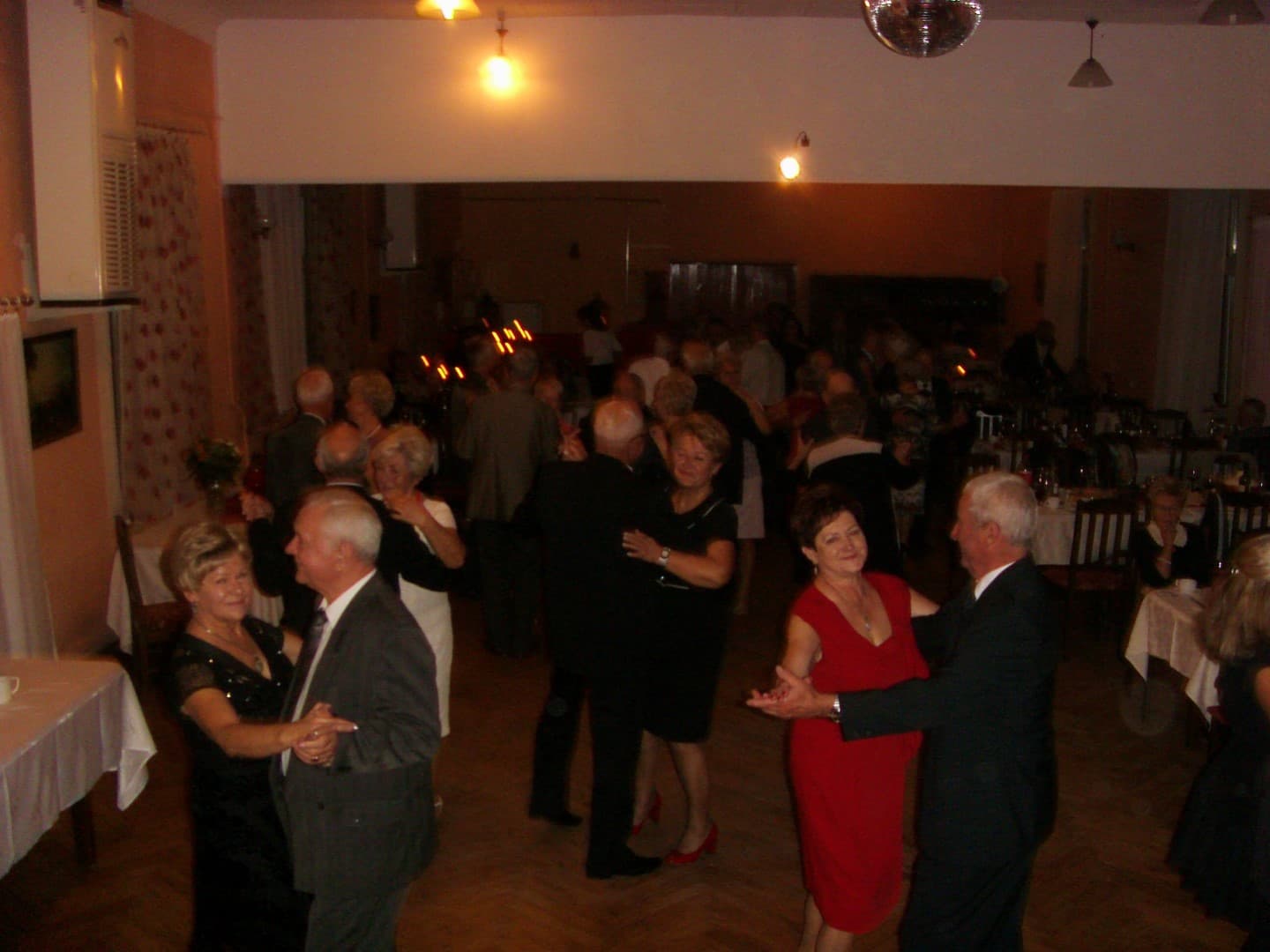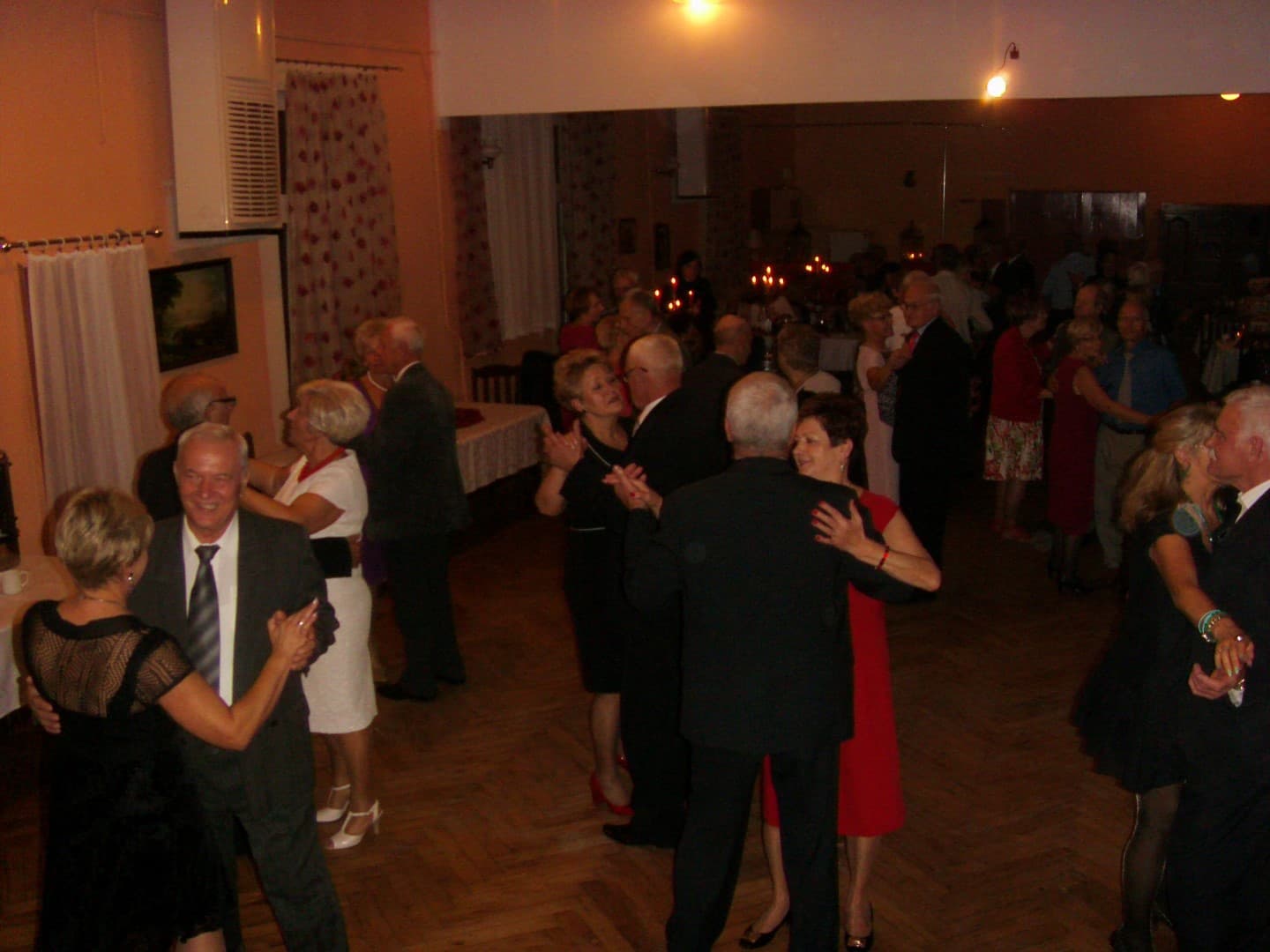 Lubimy się bawić. Każda okazja do radosnych spotkań jest dobra. Trudno nawet sobie wyobrazić, z naszym usposobieniem, 5. JUBILEUSZ, bez zabawy tanecznej. Trudu organizacyjnego zabawy podjęła się HALINKA KRASOWSKA. Do klubu TĘCZA – dobrego miejsca na wspólne pląsy – przyszło 64 elegancko ubrane osoby. Panowie, w większości, byli w garniturach, panie w nieszablonowych kreacjach. Przyszły pary i single. Nikt się nie nudził, nikt nie narzekał – bo i powodów do marudzenia nie było. Towarzystwo podobierało się zgodnie ze swoimi upodobaniami i osobistymi sugestiami. Halinka, jak ta dobra wróżka, spełniała życzenia dotyczące miejsca i lokalizacji stolików. Do tańca porywał p. ROMAN WĄSIK . Restauratorka, p. ZOSIA JAKUBISZYN zadbała o nasze podniebienia. Jedzenie było lekkie, smaczne i było go… pod dostatkiem. Obserwator z boku byłby zdziwiony, gdyby miał dostęp do naszych PESELI . Tyle w nas werwy, tyle życia, tyle radości, o pięknym wyglądzie przez skromność nie wspomnę. mpp