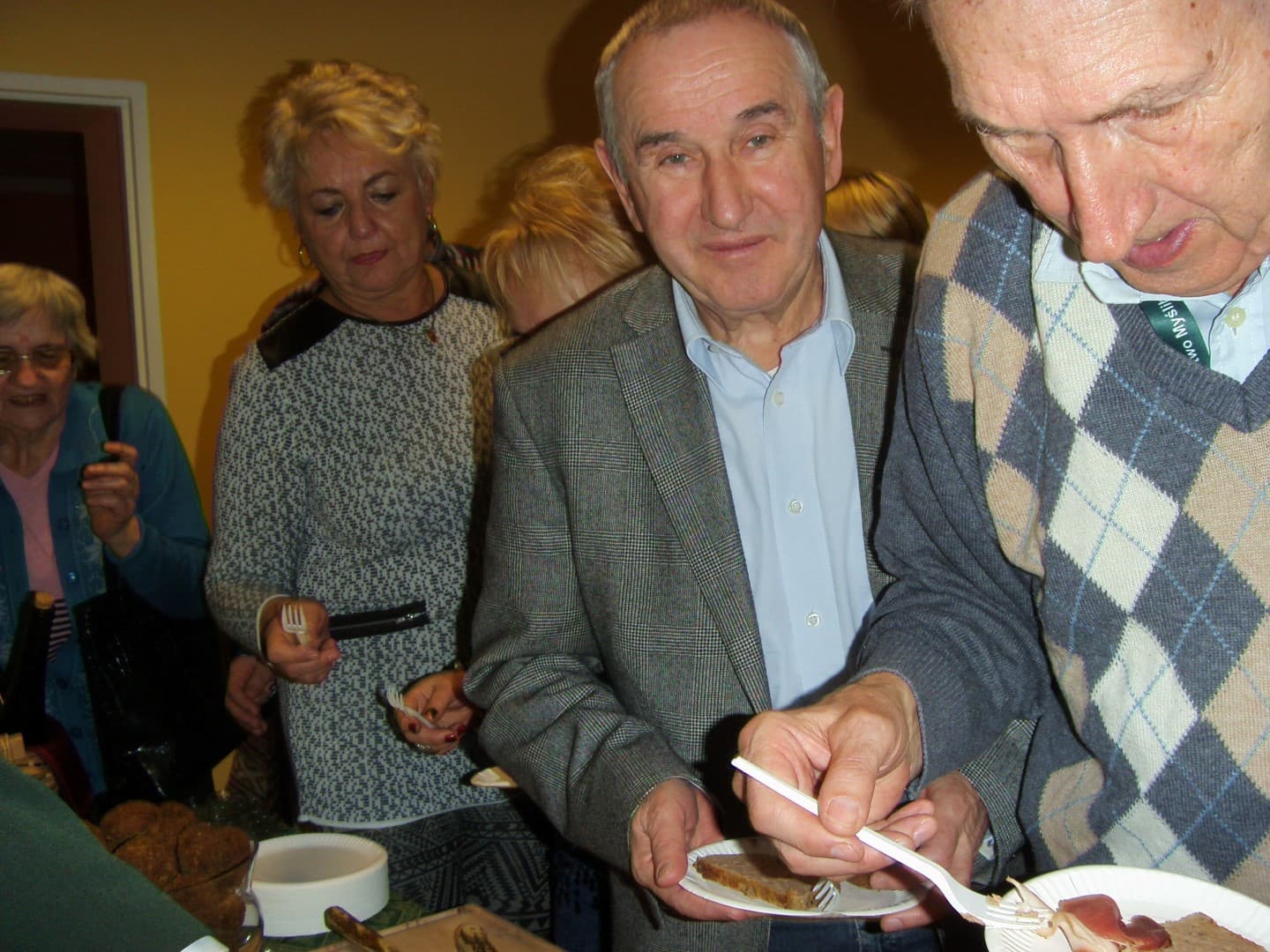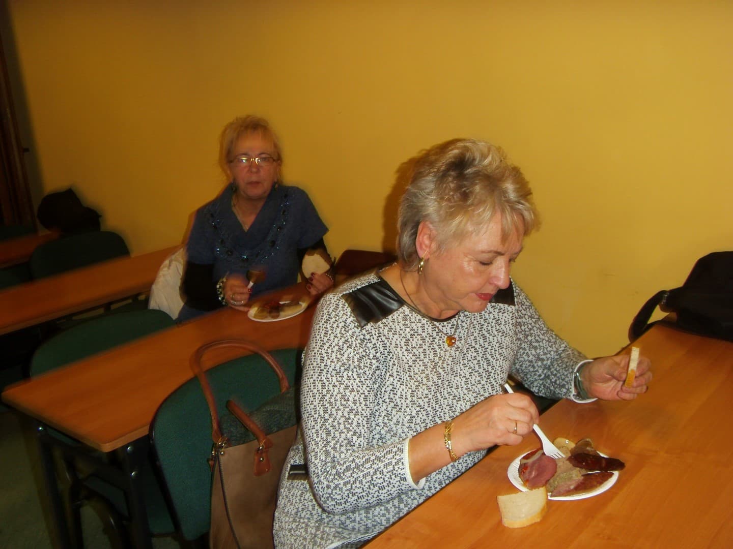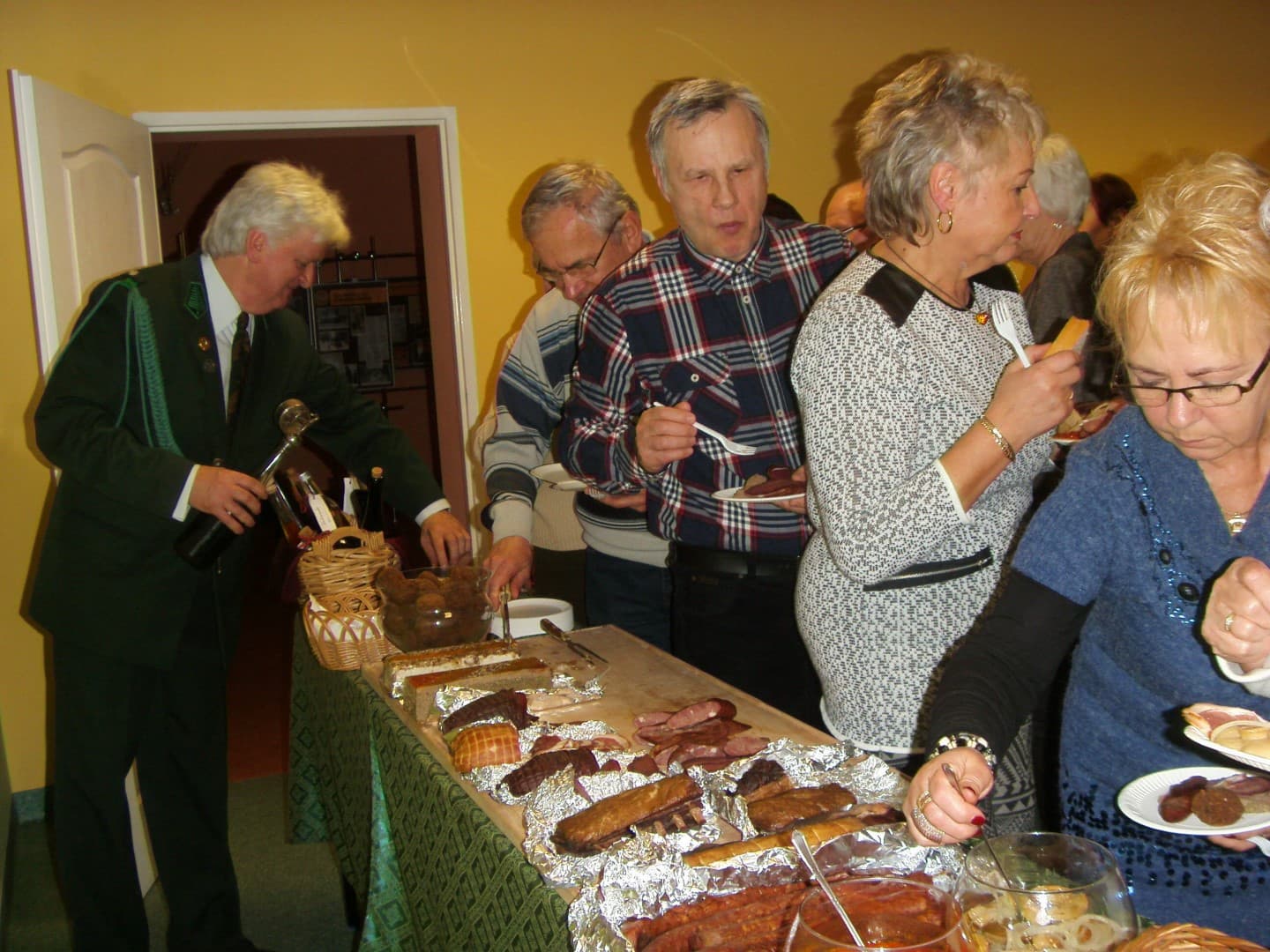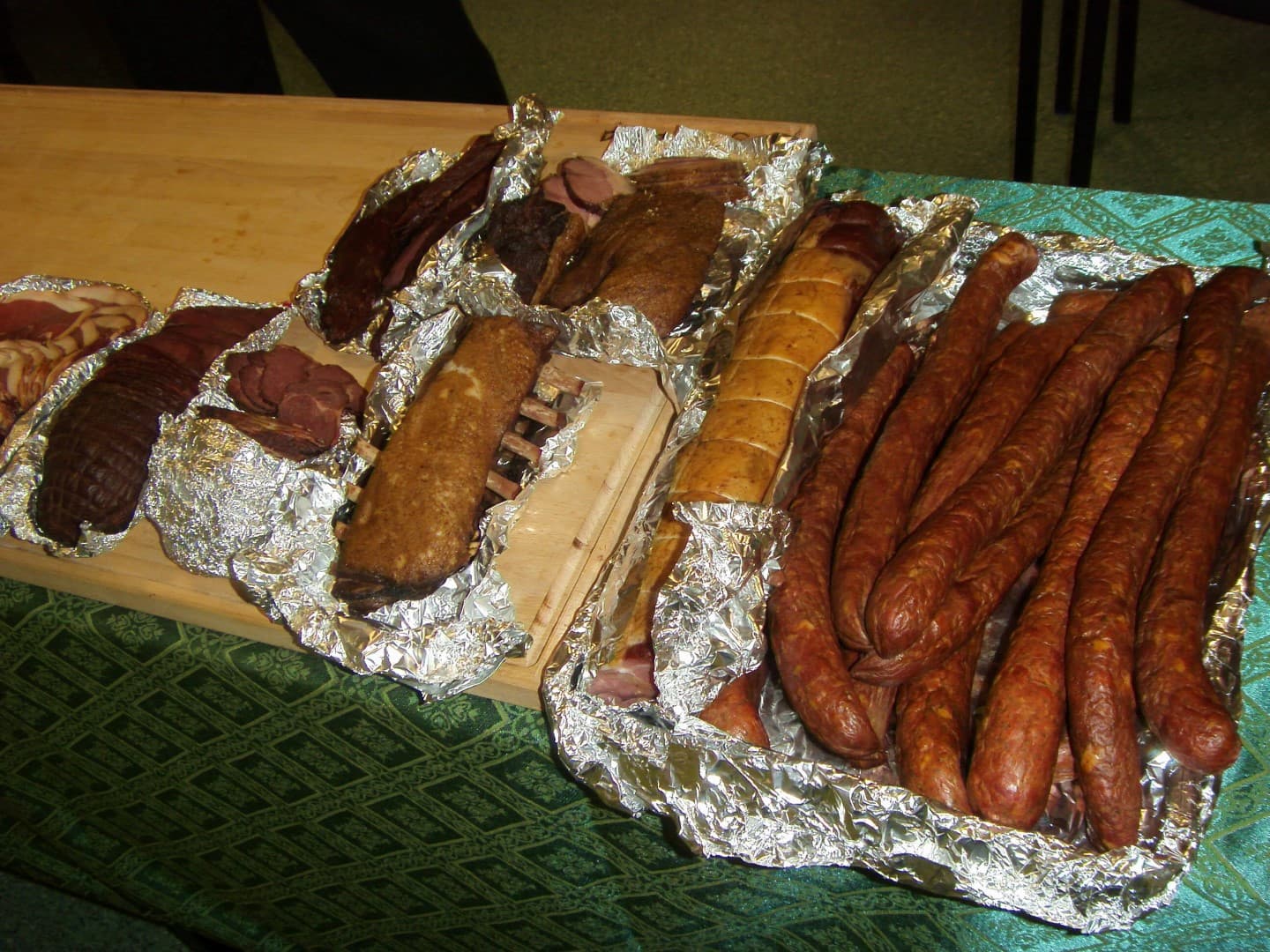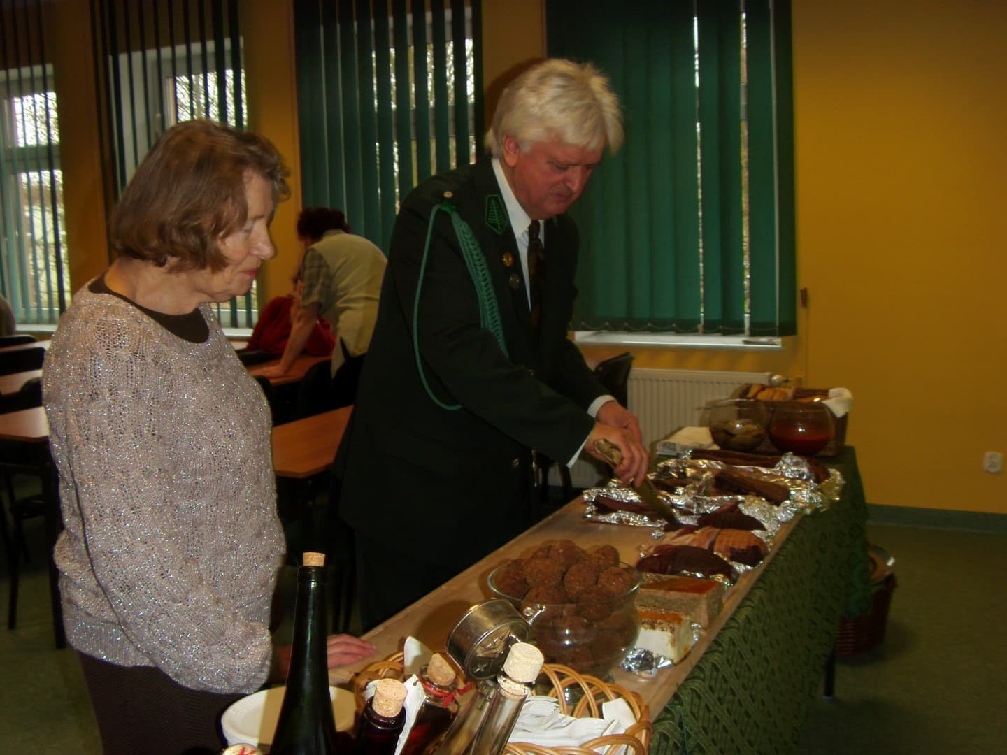 Książkowe wspomnienia, fraszki, opowiadania to kolejna dziedzina, w którą doskonale wpisują się kobiety, ale przygotowywanie potraw z dziczyzny, przepisy kulinarne to już nie jest zarezerwowane pole jedynie dla kobiet. NA SPOTKANIU UDOWODNIŁ TO, PONAD WSZELKĄ WĄTPLIWOŚĆ , NASZ KOLEGA, STUDENT, MYŚLIWY I RESTAURATOR W JEDNYM – ZYGMUNT JAKUBISZYN. Sponsorowany przez Henia Szpakowskiego dziczek został przez Zygmunta rozebrany na jadalne części pierwsze i tak przygotowany, że palce lizać. Trwało to z górą miesiąc – zalewy, przyprawy, przewracanie mięsa, podlewanie, a potem wędzenie przy użyciu drewna wiśniowego( dla koloru i smaku) – to tajemnicze rytuały znane tylko Zygmuntowi. Pasztety, boczki, kiełbasy, szyneczki, polędwiczki, kotleciki, żeberka – nad wyraz smaczne, wykwintnie podane ( mimo niemal polowych warunków), oczywiście w towarzystwie leśnych nalewek. Prawdziwa uczta dla oczu i podniebienia! Zygmuncie – NIEDOŚCIGNIONY MISTRZU OD DZICZYZNY- czoła chylimy, podziwiamy, za wypasiony paśnik dziękujemy. Darz Bór. Tekst i foto mpp.