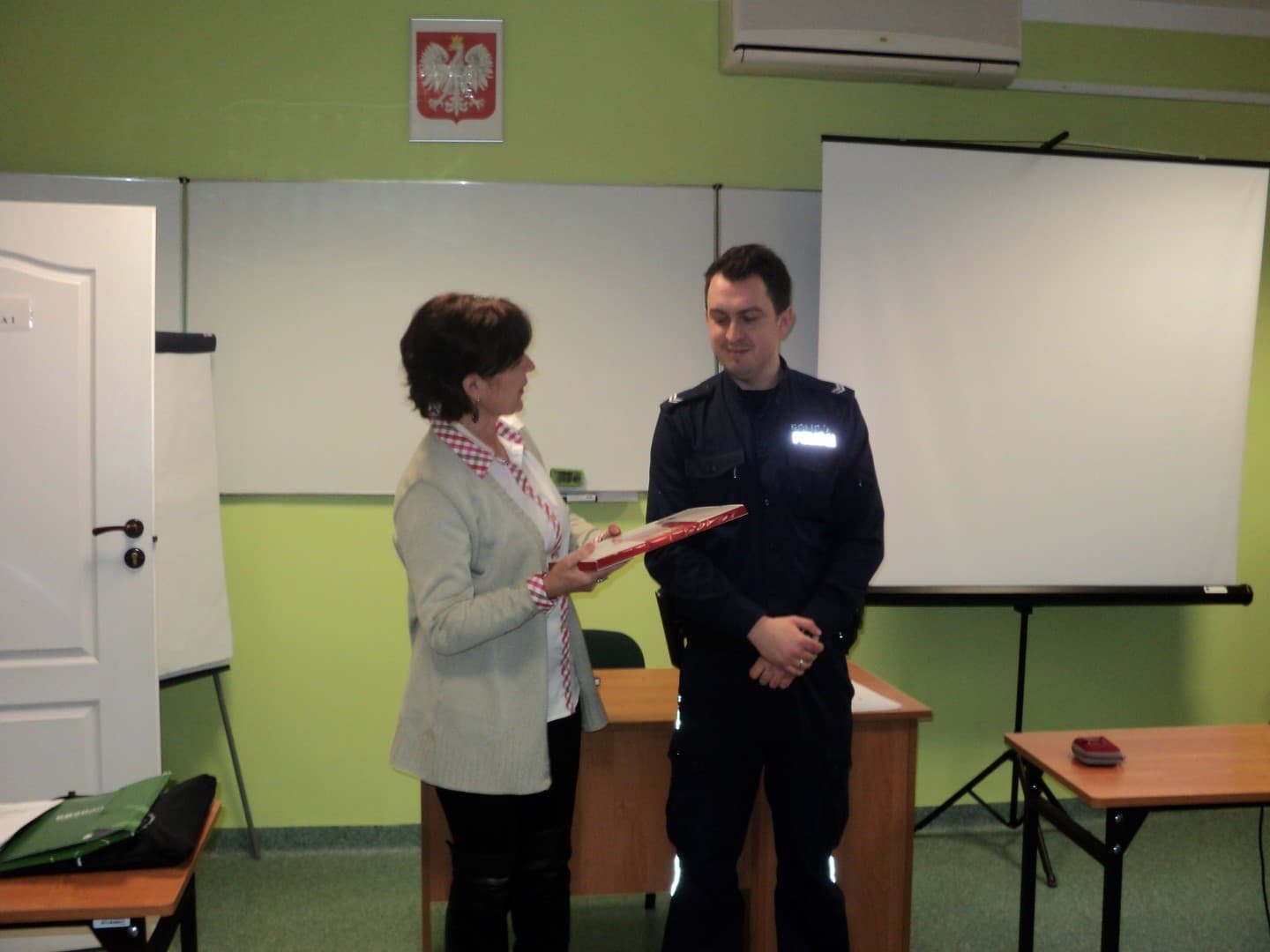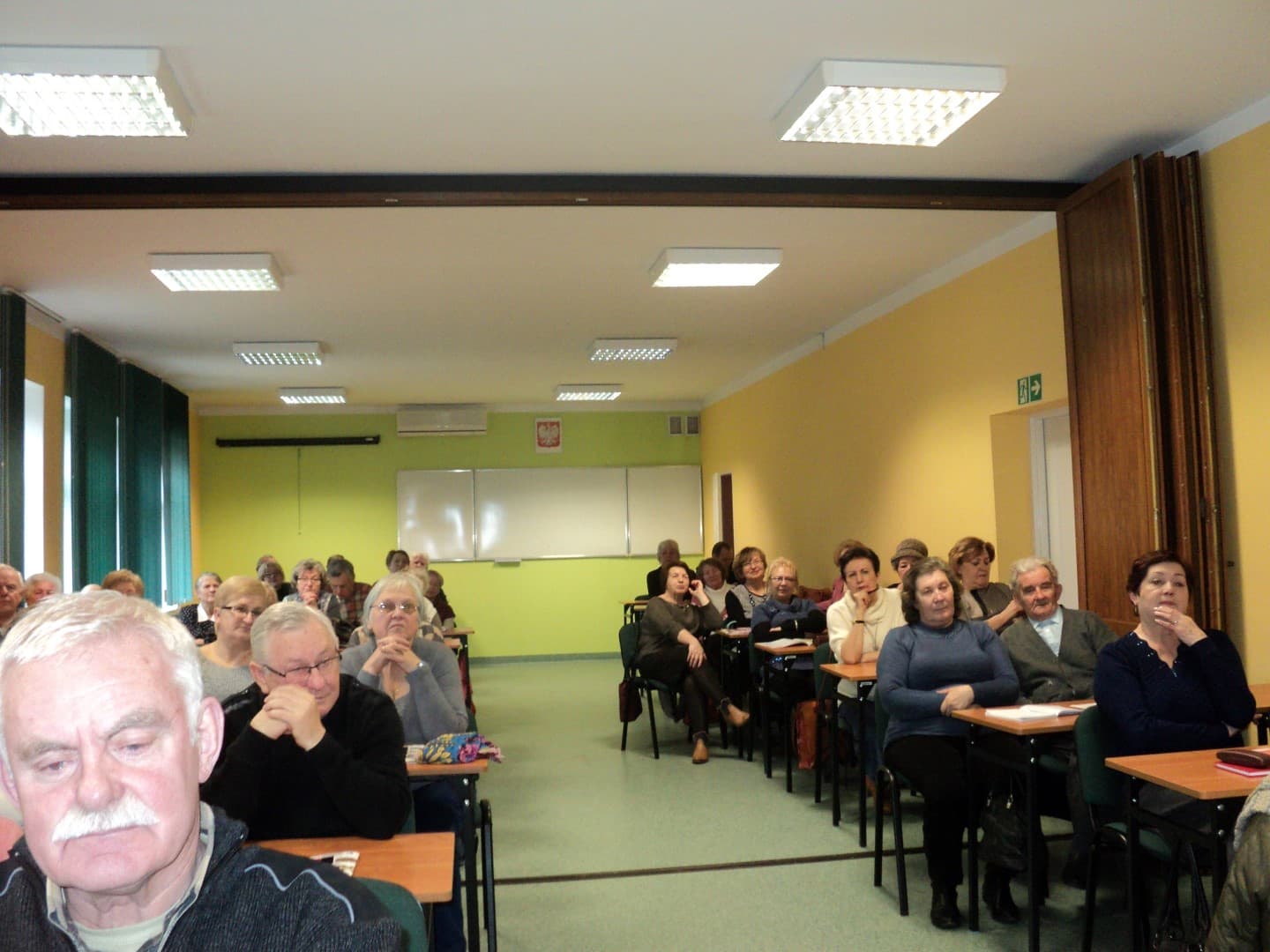 Nasz wykładowca – starszy sierżant Łukasz Jackowiak z Komendy Powiatowej Policji – bardzo przekonująco opowiadał o aktualnych metodach działania przestępców, żerujących na łatwowierności osób starszych. Tak zwaną „Metodą na wnuczka” ograbiono wiele starszych ludzi z ich życiowych oszczędności. Rzekomy „wnuczek” dzwoni z błagalną prośbą o pieniądze, bo – miał wypadek, został uprowadzony, grożą mu etc., bądź trafia mu się fantastyczna okazja kupna samochodu, nieruchomości itp. Sam przyjść nie może (to oczywiste…) wysyła więc zaufanego przyjaciela…