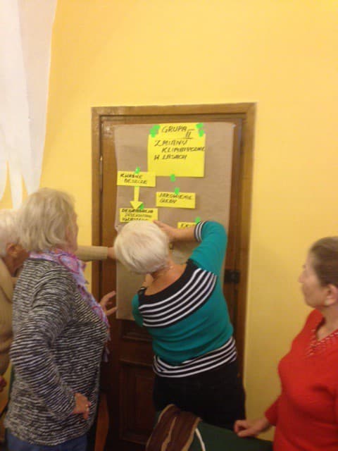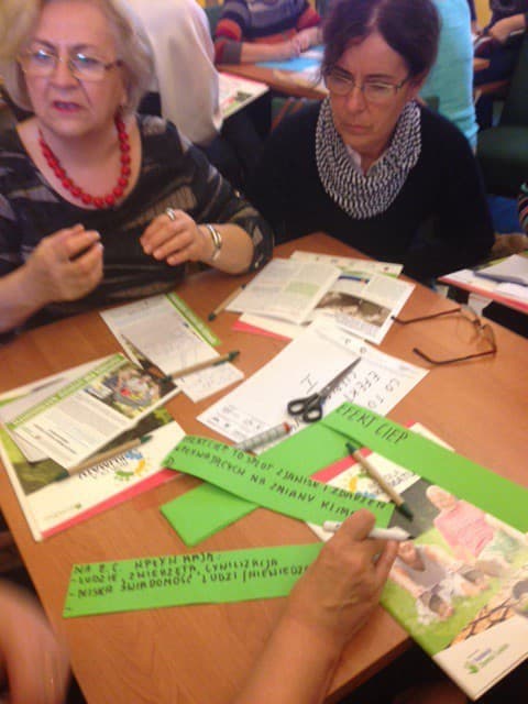 To były naprawdę świetnie zorganizowane zajęcia. Po krótkim przypomnieniu wiadomości z zakresu wiedzy o klimacie –podzieliłyśmy się na grupy.Każda grupa otrzymała zagadnienie do przedyskutowania a następnie hasłowego przedstawienia wniosków z dyskusji na planszach. A tematy nie były łatwe: