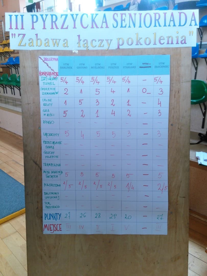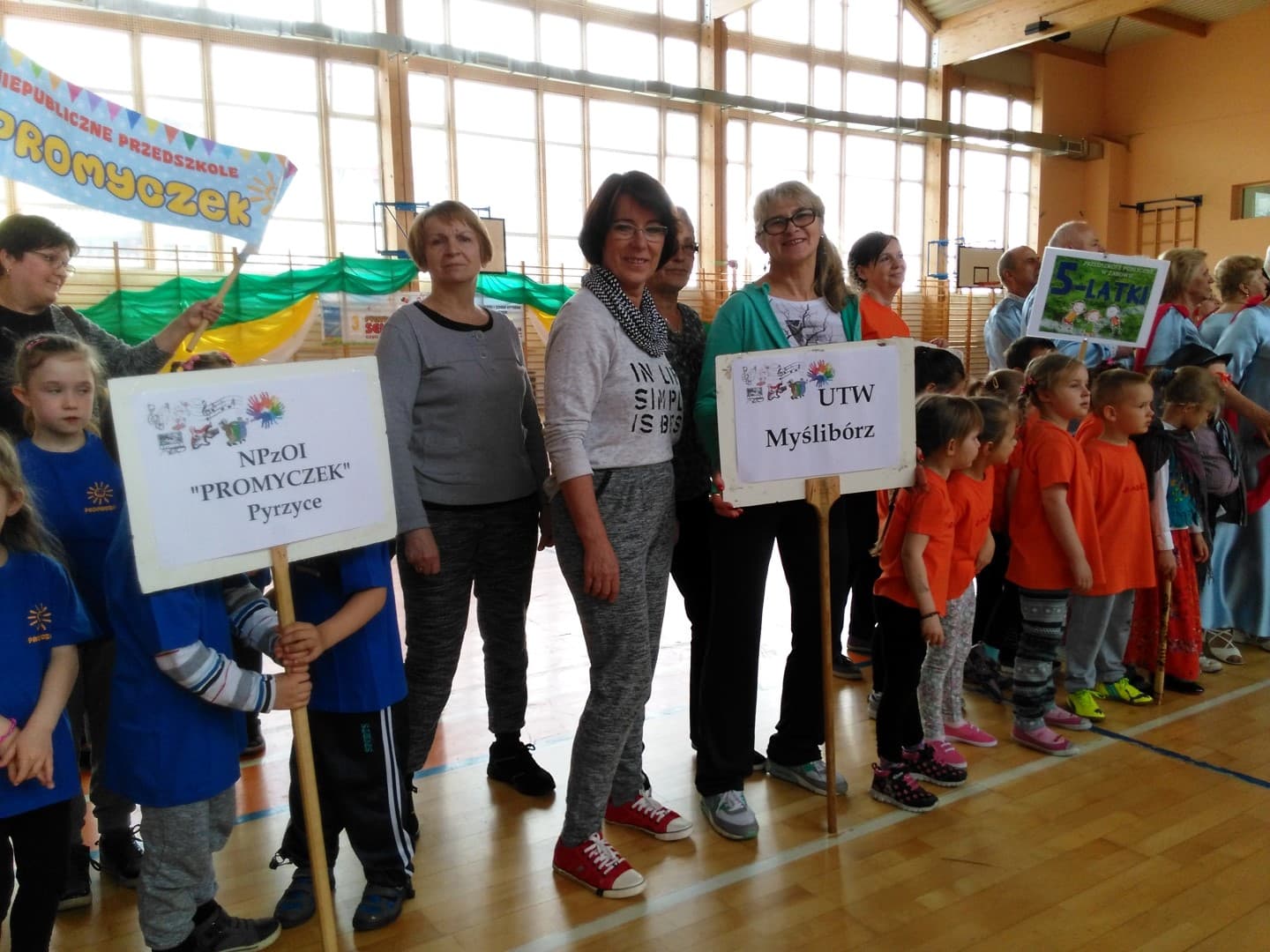 W doborowym towarzystwie przedszkolaków – były nawet milusińskie pary poprzebierane za babcię i dziadka – rozgrywane były konkurencje sprawnościowe, w których główną rolę odgrywał spryt, szybka orientacja i… prawie młodzieńczy refleks. Nie odnotowano ani kontuzji, ani urazów. Było dużo dobrej zabawy, dużo radości i śmiechu. Doping licznych kibiców zagrzewał do walki. Oprócz konkurencji sportowych były także zadania z kategorii – ćwiczenia intelektualne . Nasza grupa wywiązała się z obu ZNAKOMICIE o czym świadczy zajęcie II miejsca, zdobyta statuetka oraz dyplom. Współorganizatorem imprezy był Pyrzycki Ośrodek Sportu i Rekreacji. Imprezę otworzyła burmistrz Pyrzyc – pani MARZENA PODZIŃSKA. Organizatorzy zadbali o regenerację sił po zawodach – słodki poczęstunek ,napoje, zupa szybko uzupełniły straconą przez wysiłek energię.