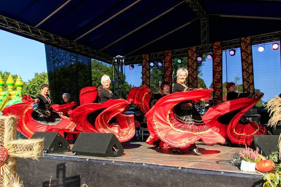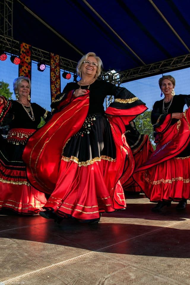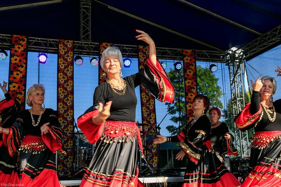 Na scenie występowali soliści, kapele, chóry i tancerze. W tym znamienitym gronie, 2 swoje układy, zaprezentowały BABYLONKI z MUTW. Jeden z tańców był już wielokrotnie pokazywany i zawsze gorąco przyjmowany przez widzów, drugi taniec był bardziej spontaniczny , prawie debiutancki z racji poszerzonego składu tancerek i powstał z potrzeby chwili. Tancerki barwnie i szumnie – sprawiły to bogate stroje – zagospodarowały scenę , na której, solistka – wspomniana wyżej p. Małgorzata Michalczyk, zaśpiewała cygańską piosenkę ,, Jadą wozy kolorowe”. Oklaski świadczyły o życzliwym przyjęciu także i tego nowego układu. A widzów było wyjątkowo dużo tego roku!