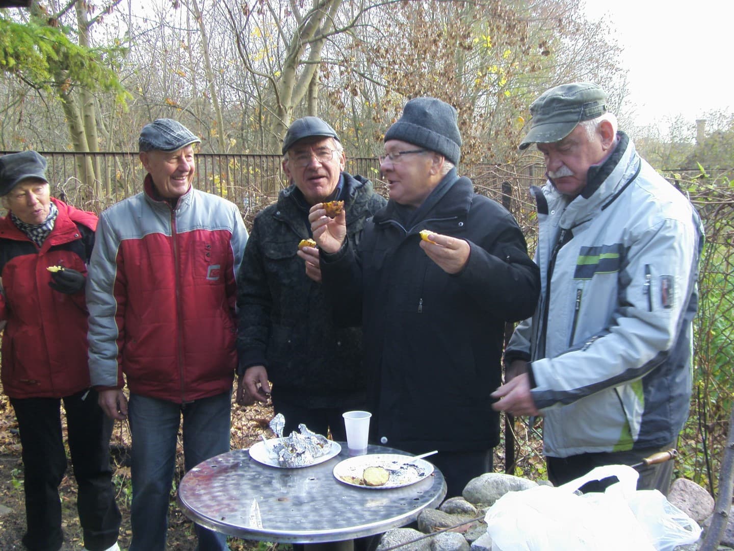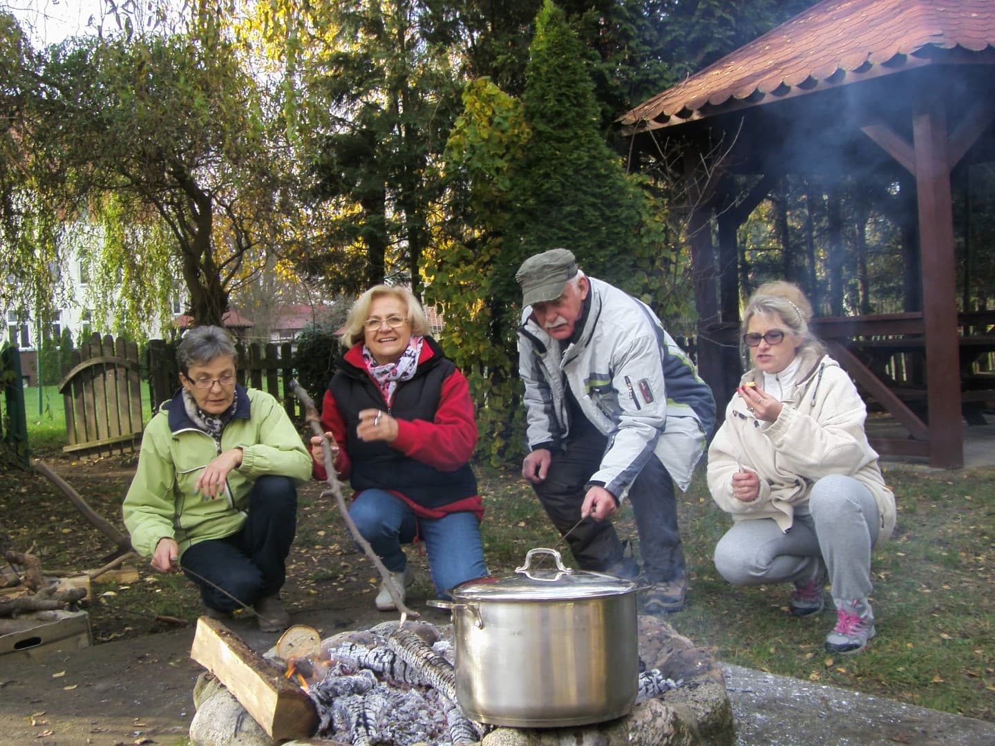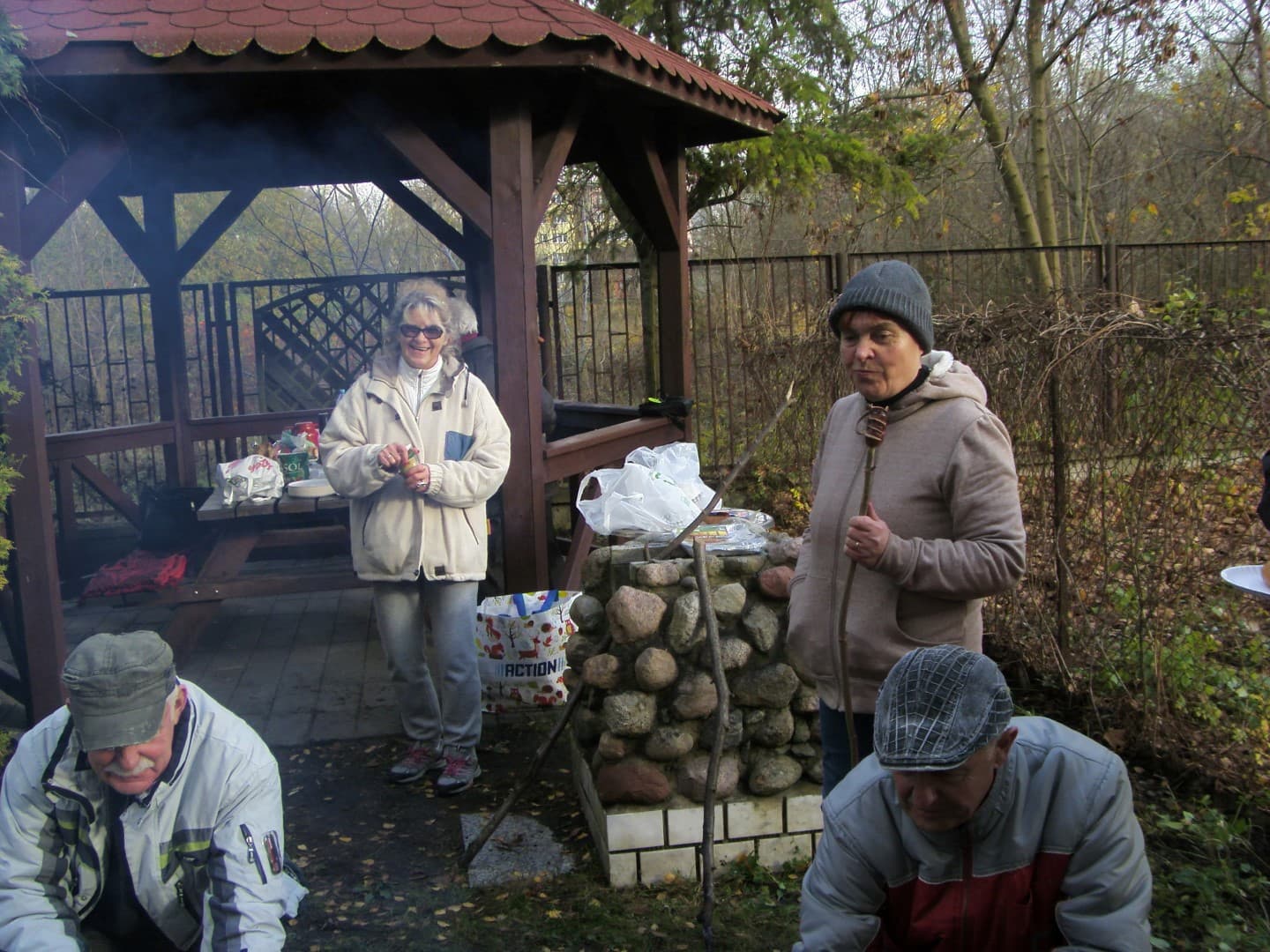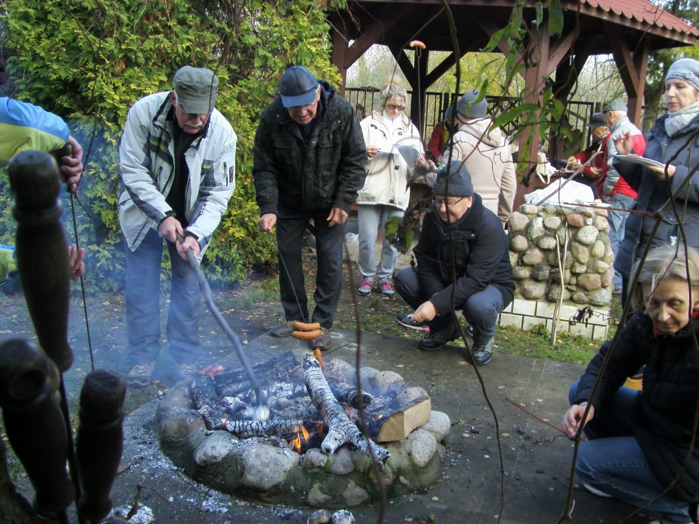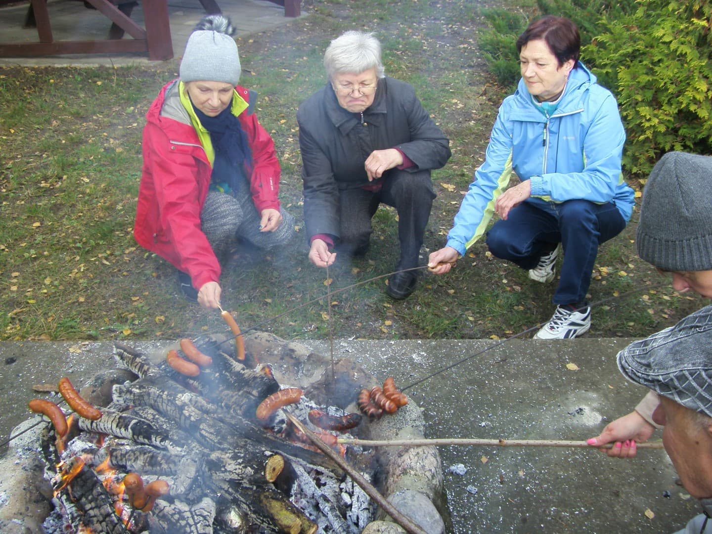 A potem czekała nagroda – spotkanie przy ognisku z pieczeniem ziemniaków, kiełbasek i chleba. Panowie: MARIAN CHOŁOCIŃSKI (który te ziemniaczki już w domu lekko podgotował i owinął ,jak ten świstak, w sreberka), z ANTONIM i JÓZEFEM pilnowali ogniska i ceremonii pieczenia. Dziewczyny natomiast , zagospodarowały pozostałą przestrzeń – gościnnie ofiarowaną przez dyrektor DOMU WCZASÓW DZIECIĘCYCH– panią KATARZYNĘ CZERWIŃSKĄ.
