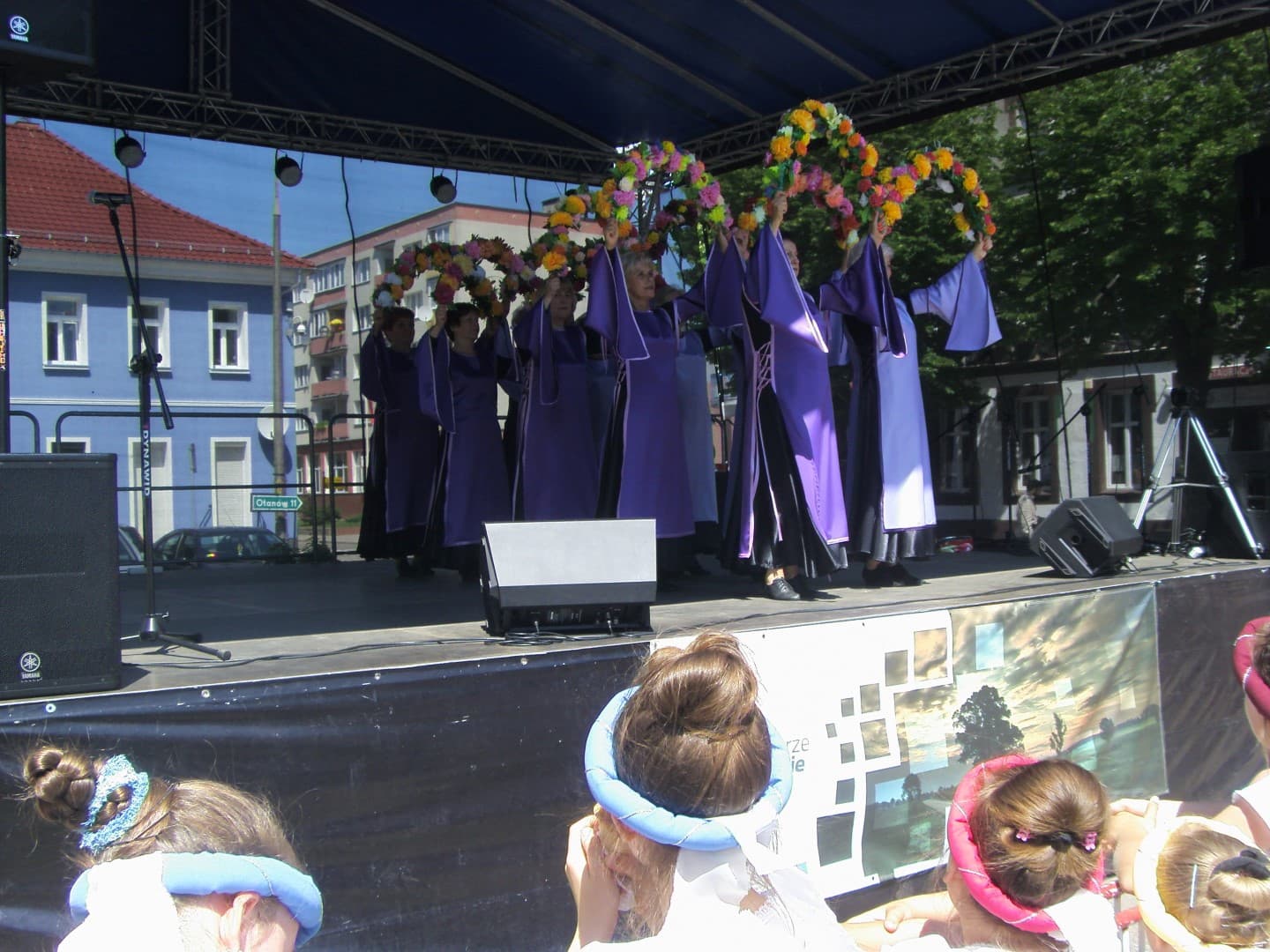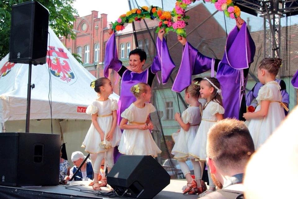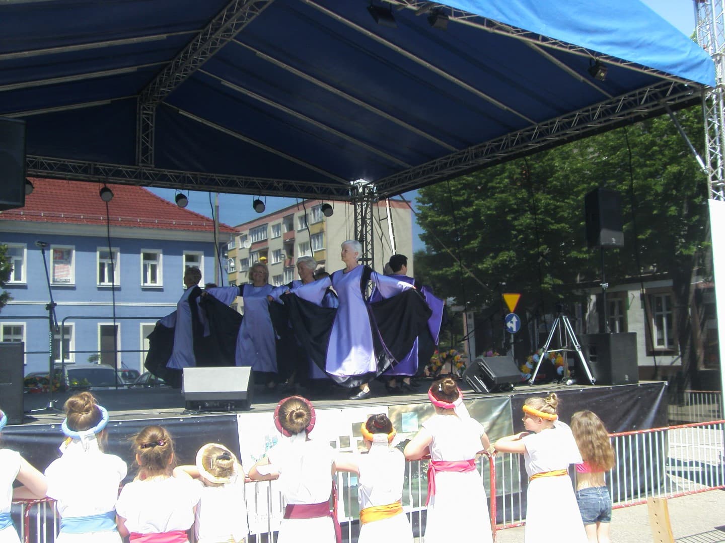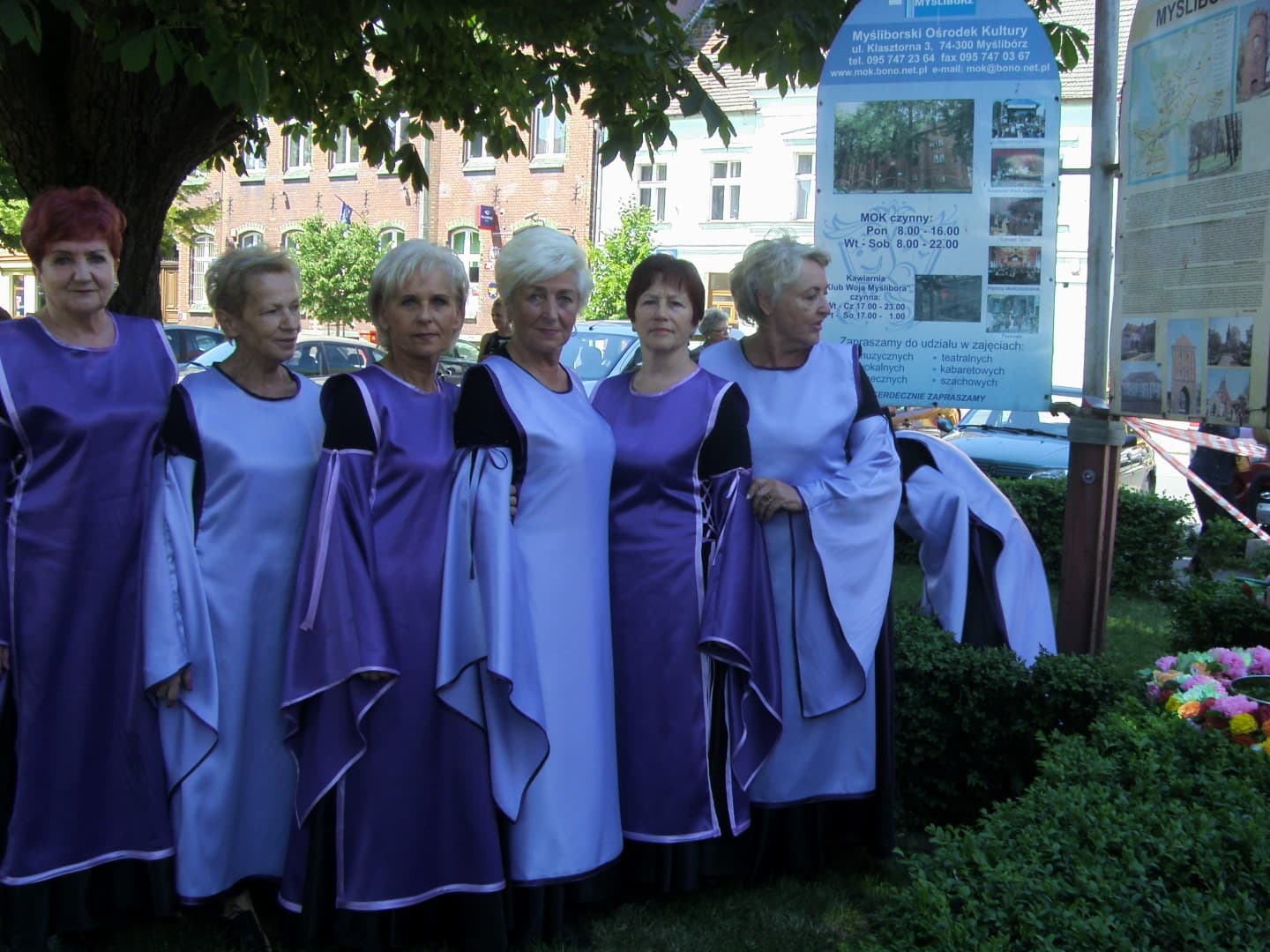 W to wszystko włączył się zespół BABYLON z MYŚLIBORSKIEGO UNIWERSYTETU TRZECIEGO WIEKU z 3 tańcami średniowiecznymi. Pokazano PRACZKI, MOTYLE I CHODZONY z bogatymi rekwizytami i odpowiednimi strojami. Dorosłe tancerki odebrały liczne gratulacje, na które zresztą ,jak wszyscy inni, gorąco zasłużyły. Pochlebne słowa sprawiły, że jakby upał mniej doskwierał, nawet ręce i nogi mniej bolały mocno nadwyrężone prawie dwutygodniowymi treningami po 2-3 godziny dziennie. Wizja KRYSTYNY MATUSZAK – perfekcyjnego wykonania 3 układów – została zrealizowana. HALINA KRASOWSKA dzielnie jej w tym pomagała. Dobra wola BABYLONEK, poparta niewątpliwym talentem, była przysłowiową kropką nad i. Kolejny raz … wyszły z twarzą i z tarczą , jak na rycerskie czasy przystało.