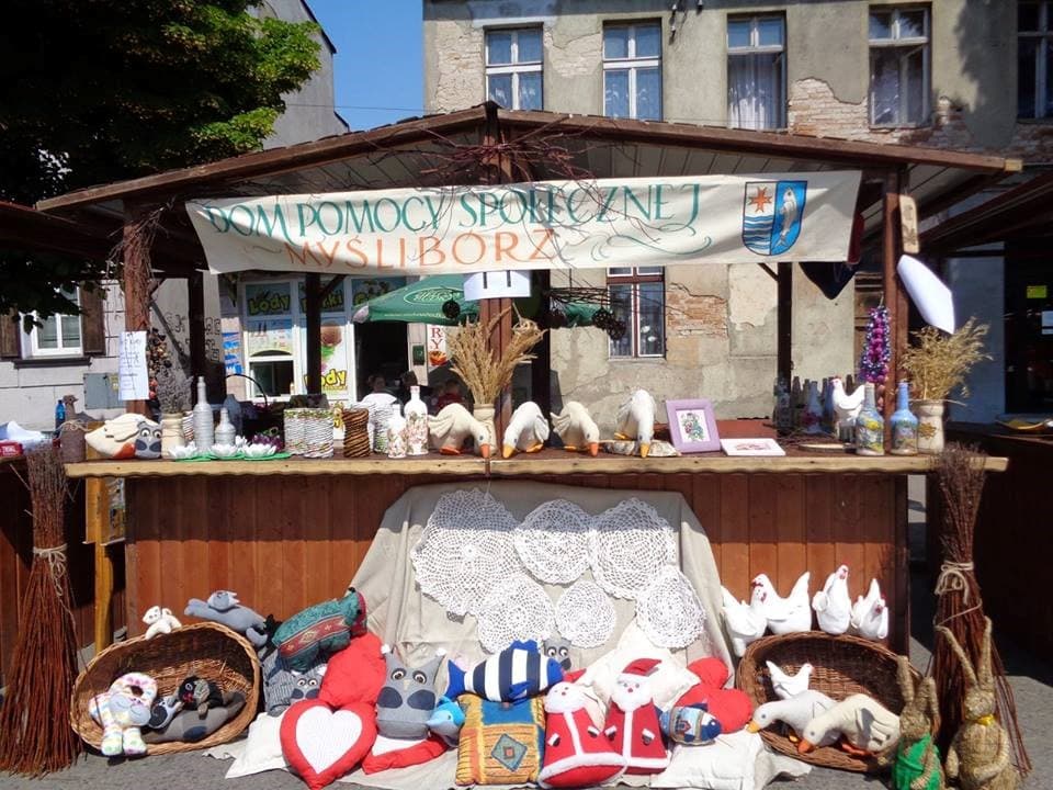 Liczne stragany, jak na jarmark przystało, kusiły , wabiły rękodziełem i przysmakami. Zaciekawiała prezentacja dawnych rzemiosł. Było barwnie, wesoło, radośnie i HUCZNIE– za sprawą wystrzału,, armatniego”. W jarmarku brało czynny udział grubo ponad 200 osób. Myśliborzanie przyłączyli się do wspólnej zabawy. Wzruszały poprzebierane dzieci, szczególnie dzielna malutka ANITKA BRZOSTOWSKA noszona przez rodziców i starsze siostrzyczki w koszu na bielizną. Wszyscy byli ubrani w historyczne stroje. A nie było łatwo, bo słoneczko dawało o sobie mocno znać od samego ranka.