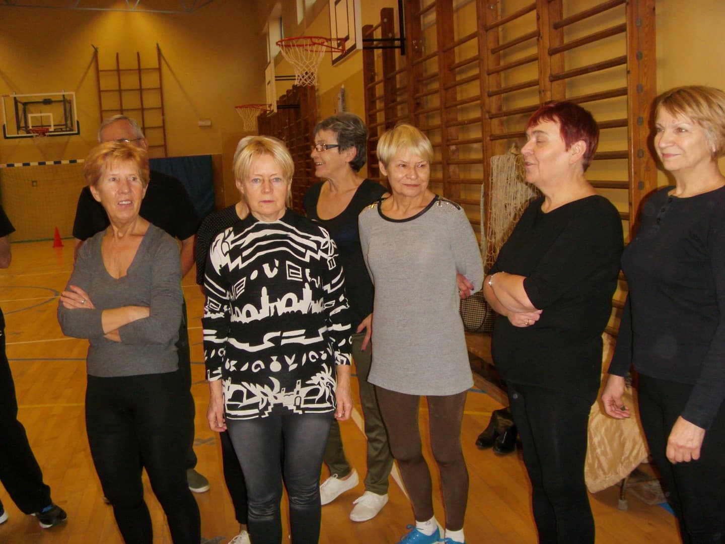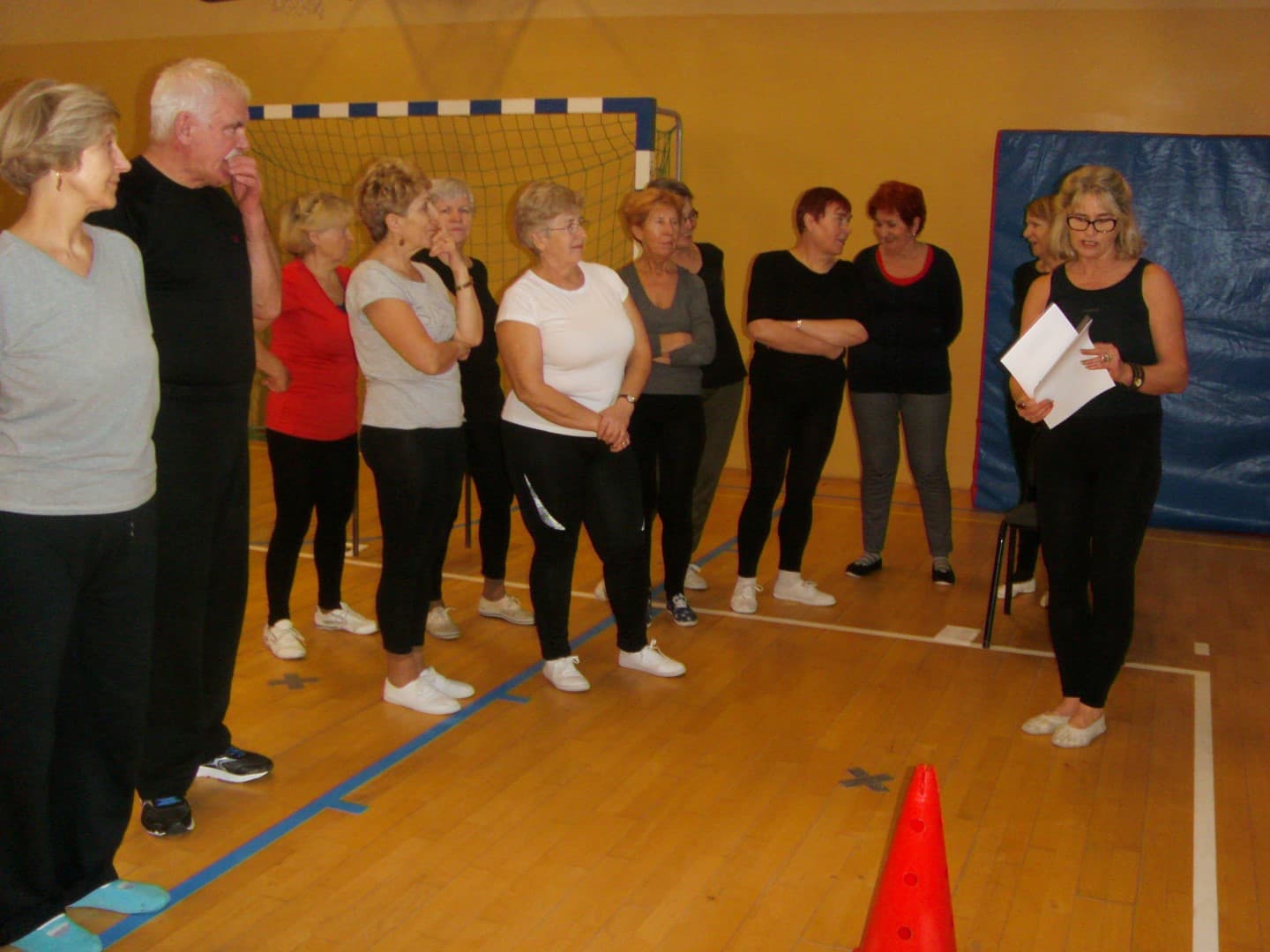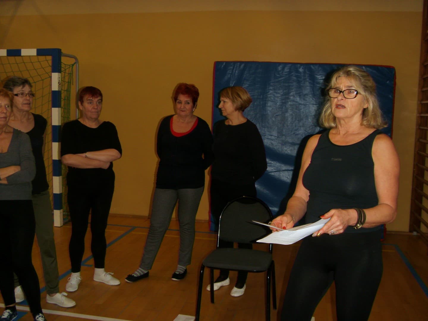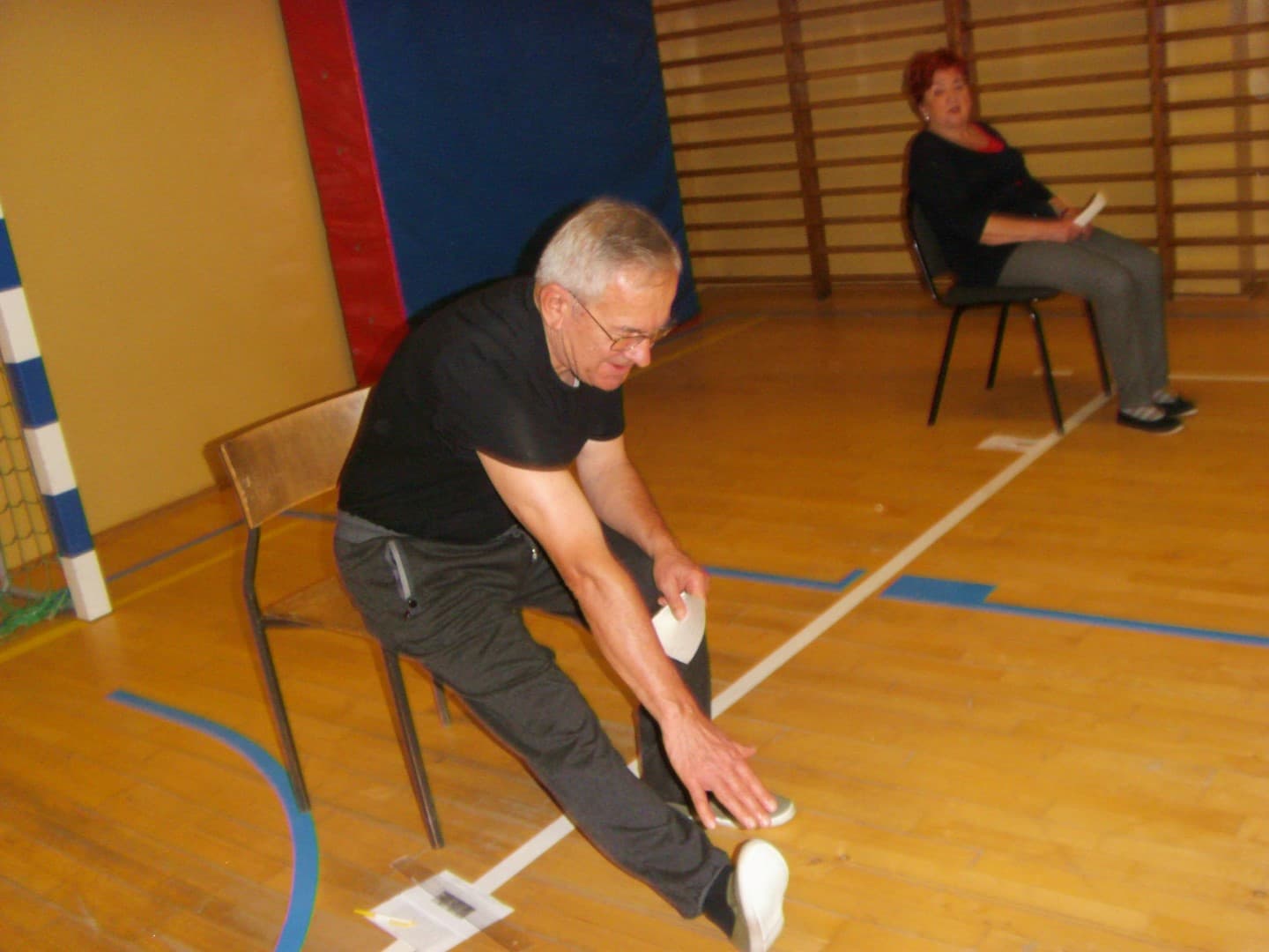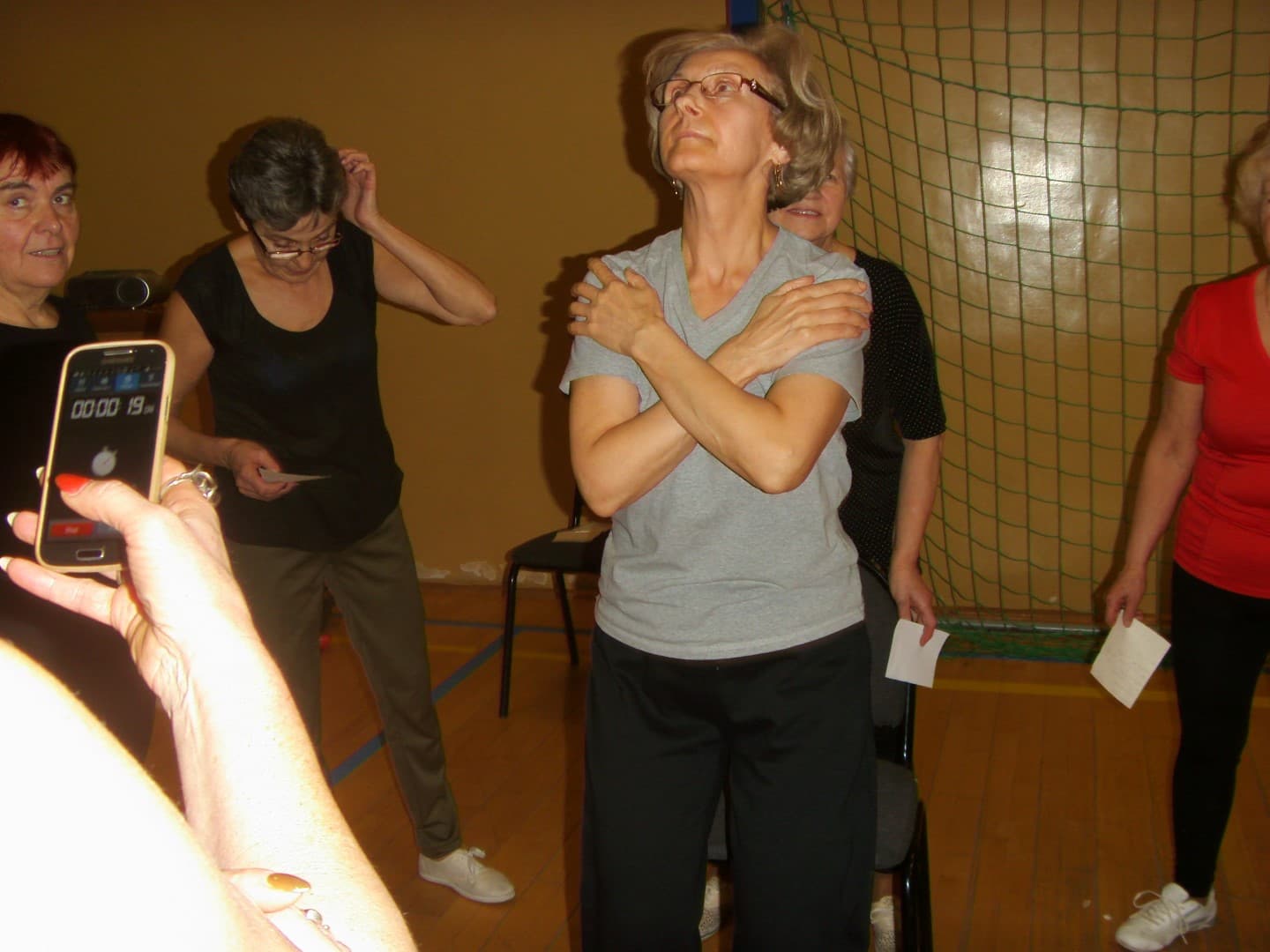 Po rozgrzewce, którą jak zwykle prowadziła DOROTA CHOŁOCIŃSKA, do testów przystąpiło 21 osób. Tradycyjnie – przeważały kobiety. Trzeba jednak uczciwie odnotować, że razem z paniami ,,testowało się” 3 panów. Próby nie były ani skomplikowane, ani trudne. Na czas zginano przedramię z 2 kg obciążeniem, wstawanie i siadanie na krześle w czasie 30 sekund było kolejnym sprawdzianem, ,, agrafka” czyli drapanie się wysoko po plecach to test nr 3 ,dosięganie na siedząco czubków palców wyprostowanej nogi to test 4, wstań i idź ( na czas oczywiście) – test nr 5. Ostatni test to marsz. Do pokonania było 50 m. Liczono okrążenia .Trzeba się było zmieścić w czasie 6 min. Najmłodsza uczestniczka miała 58 lat, najstarsza 84. Nie było rażących odstępstw. Wyniki były bardzo zbliżone. Wszyscy bardzo się starali. Wyczuwało się atmosferę konkurencji, ale to było potrzebne – wszak musieliśmy dać z siebie wszystko. Poza tym było dużo radości, śmiechu , dobrej zabawy i żadnego spięcia. Jak się okaże, że jesteśmy lepsi od Amerykanów… TO GÓRĄ NASI!