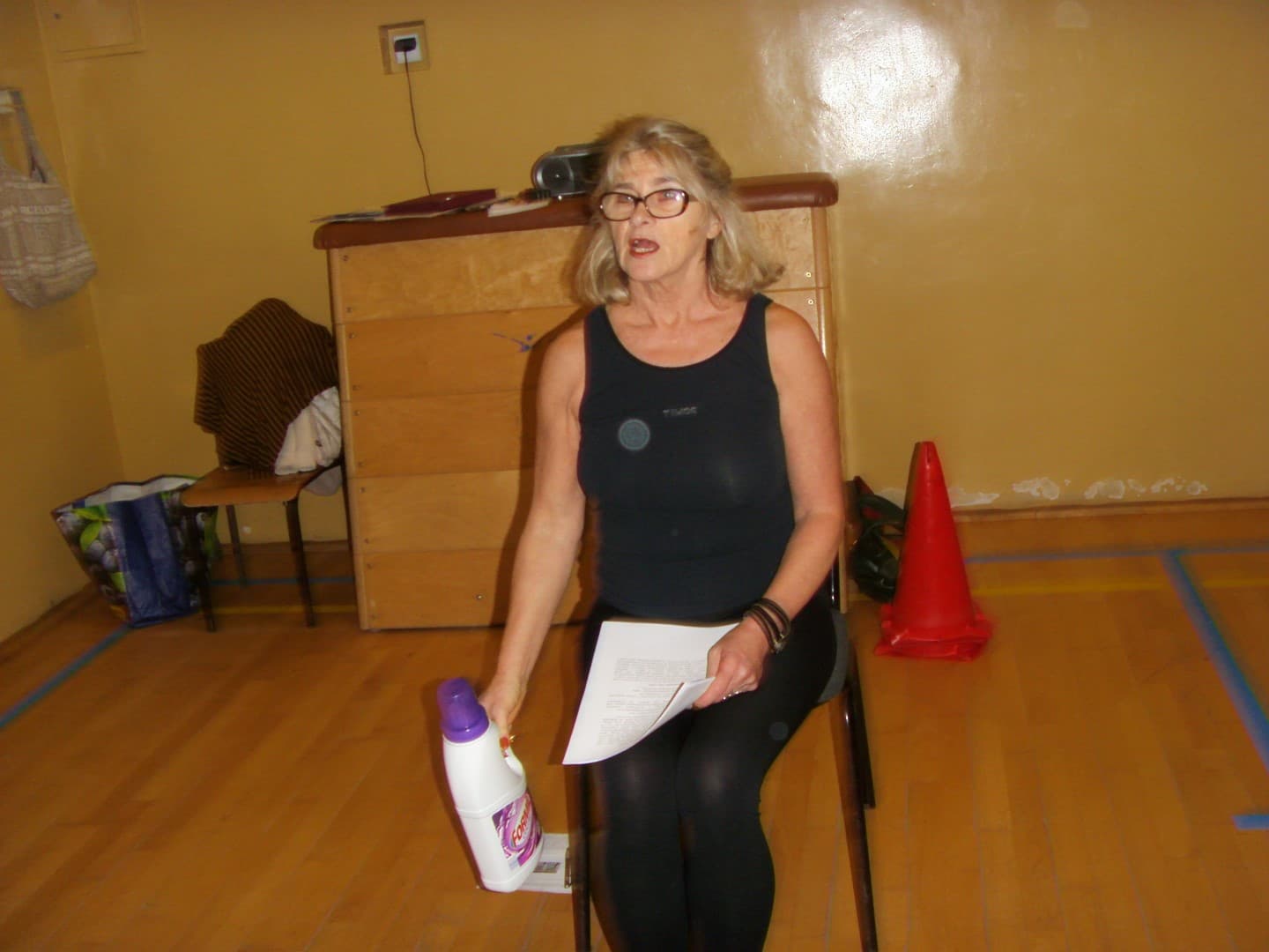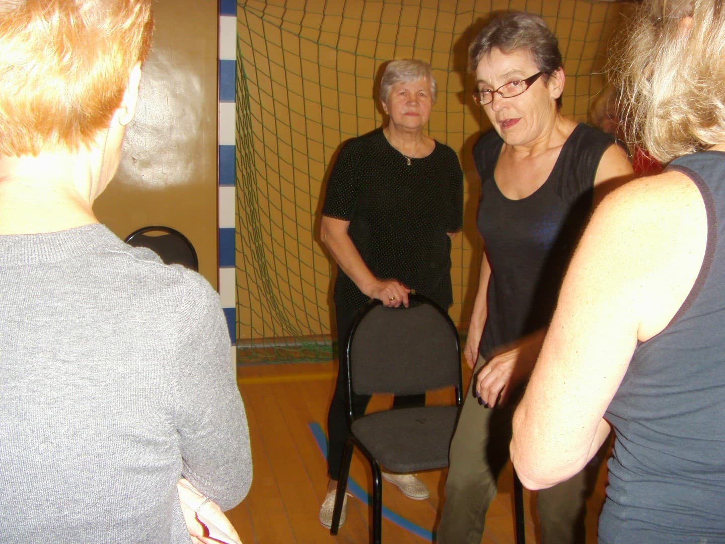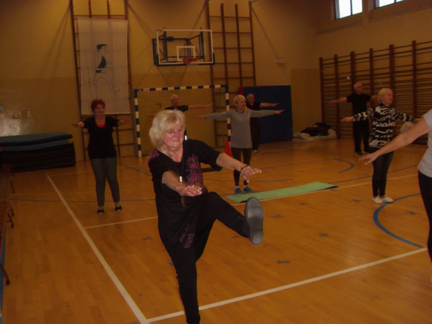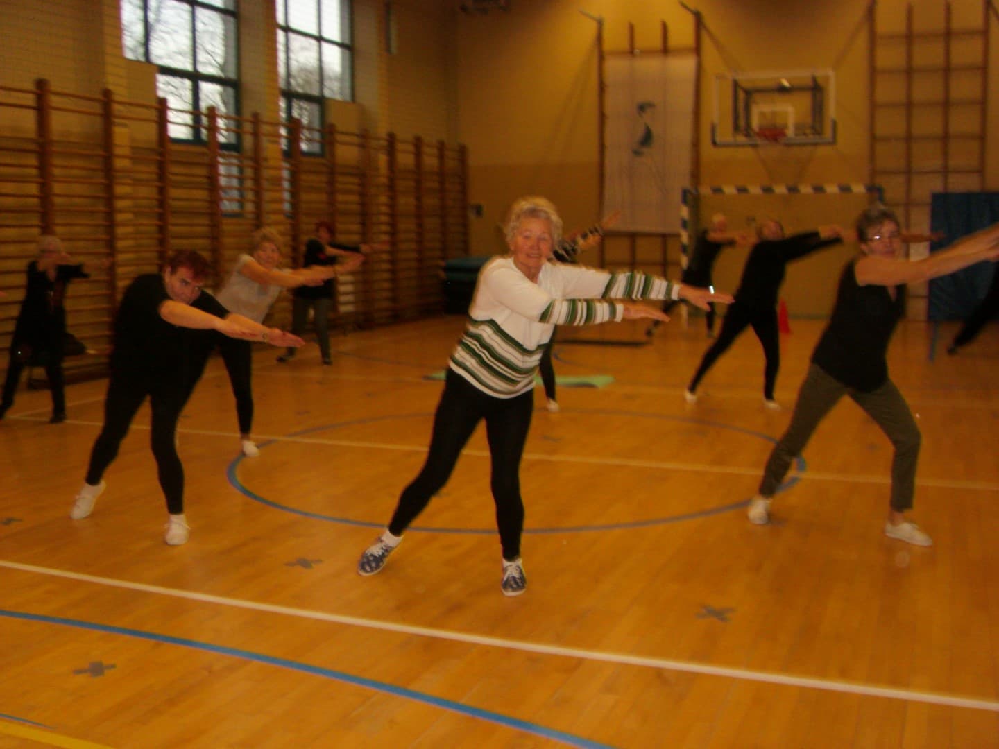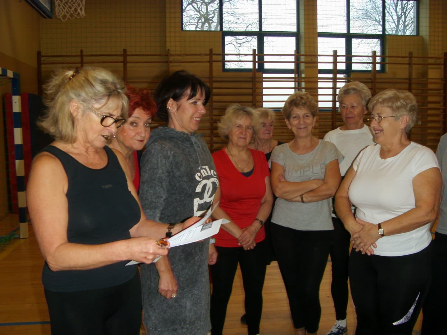 Po rozgrzewce, którą jak zwykle prowadziła DOROTA CHOŁOCIŃSKA, do testów przystąpiło 21 osób. Tradycyjnie – przeważały kobiety. Trzeba jednak uczciwie odnotować, że razem z paniami ,,testowało się” 3 panów. Próby nie były ani skomplikowane, ani trudne. Na czas zginano przedramię z 2 kg obciążeniem, wstawanie i siadanie na krześle w czasie 30 sekund było kolejnym sprawdzianem, ,, agrafka” czyli drapanie się wysoko po plecach to test nr 3 ,dosięganie na siedząco czubków palców wyprostowanej nogi to test 4, wstań i idź ( na czas oczywiście) – test nr 5. Ostatni test to marsz. Do pokonania było 50 m. Liczono okrążenia .Trzeba się było zmieścić w czasie 6 min. Najmłodsza uczestniczka miała 58 lat, najstarsza 84. Nie było rażących odstępstw. Wyniki były bardzo zbliżone. Wszyscy bardzo się starali. Wyczuwało się atmosferę konkurencji, ale to było potrzebne – wszak musieliśmy dać z siebie wszystko. Poza tym było dużo radości, śmiechu , dobrej zabawy i żadnego spięcia. Jak się okaże, że jesteśmy lepsi od Amerykanów… TO GÓRĄ NASI!