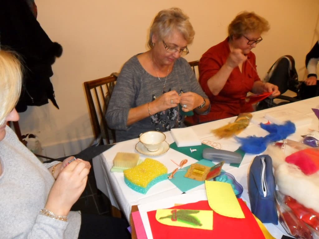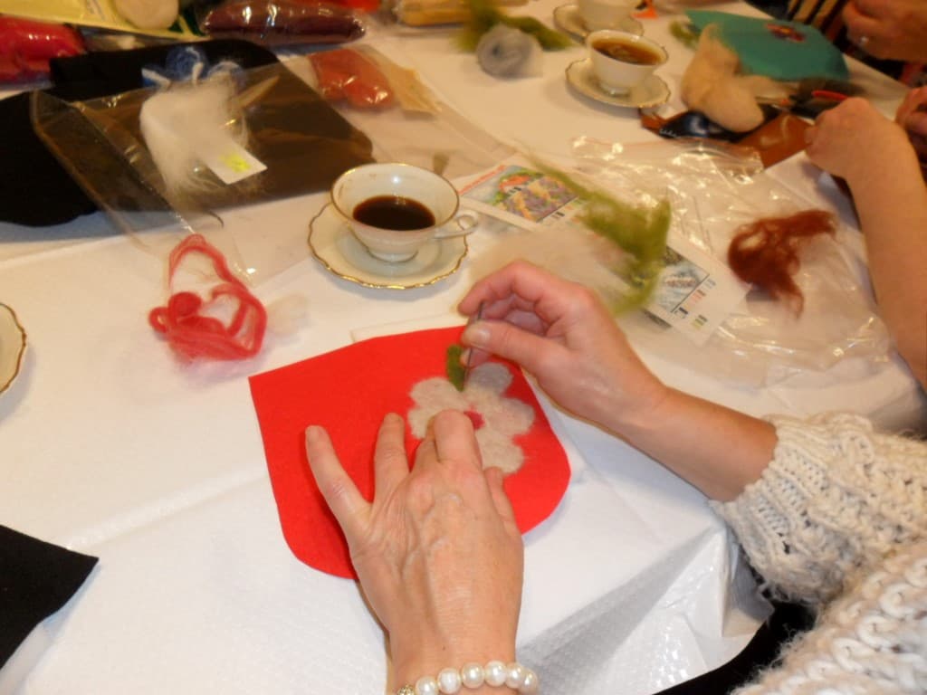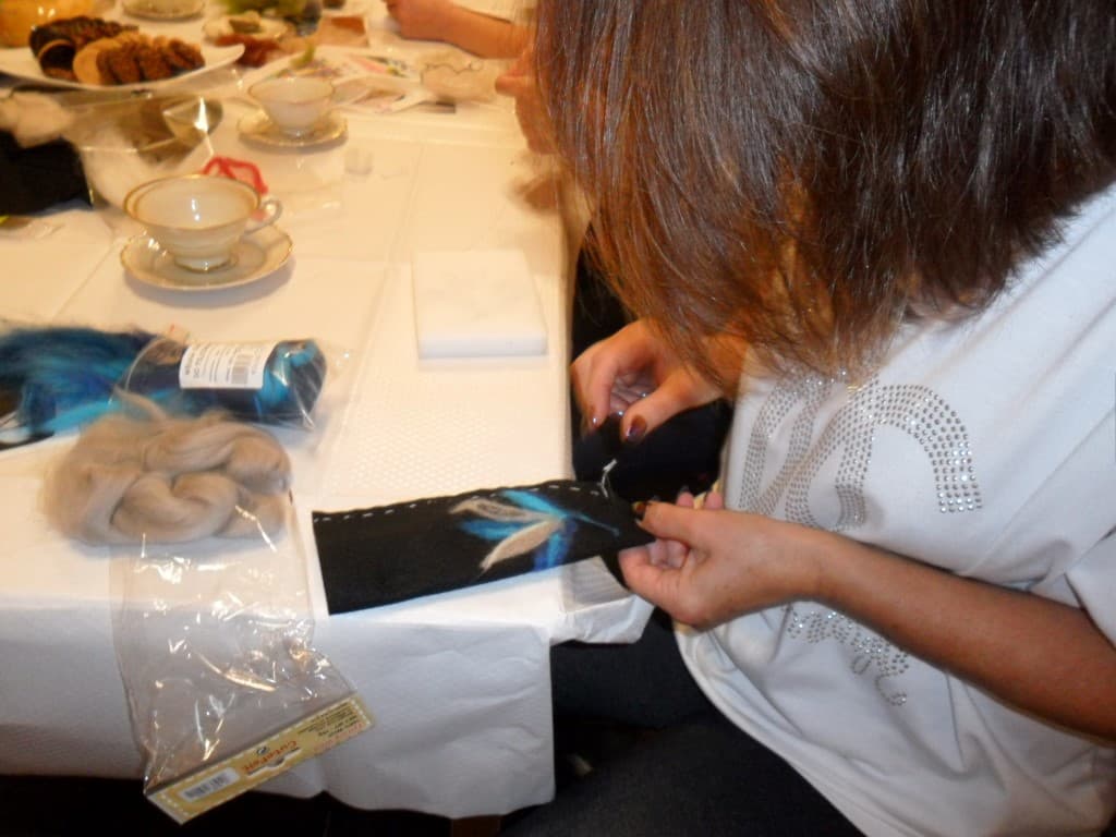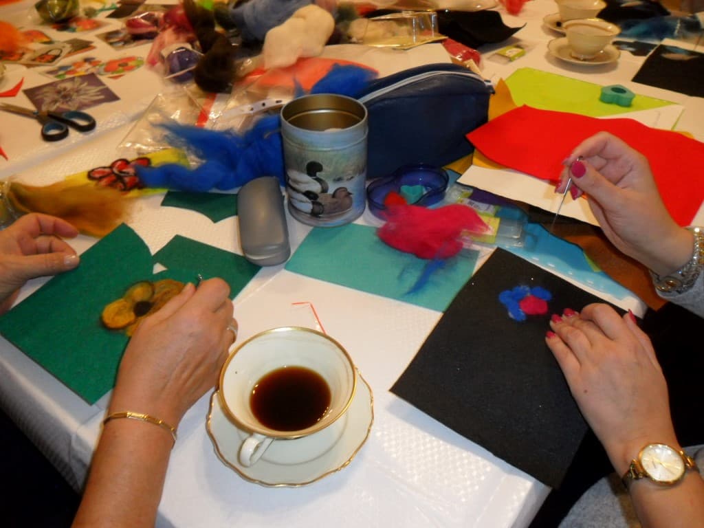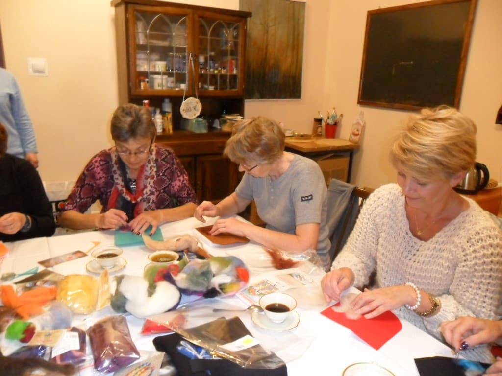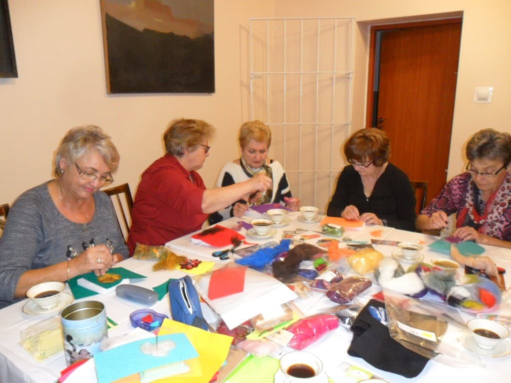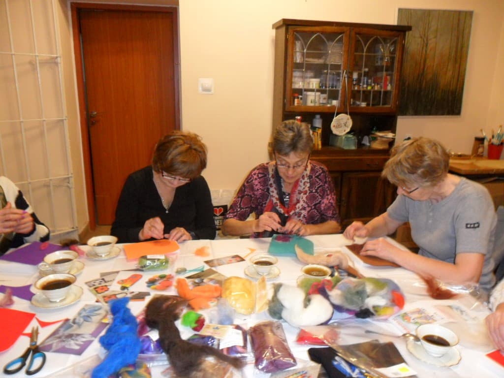 Kraina filcu to temat kolejnych warsztatów rękodzieła artystycznego, na których pod czujnym okiem instruktorki, pani Basi Buchla, reozpoczęliśmy przygodę z filcowaniem na sucho. Po krótkim wstępie, pokazaniu materiałów, narzędzi i prezentacji gotowych prac wykonanych przez panią Basię, uzbrojone, niczym ołowiane żołnierzyki, w metalowe igły ruszyłyśmy na podbój wełny czesankowej, aby z przepięknych kolorów nitek zrobić aplikacje kwiatowe na filcowym etui do okularów. Uważny obserwator widziałby, z jakim zacięciem, skupieniem i satysfakcją śmigały igiełki w naszych rękach. Przemiana wełny w wielobarwne ogrody kwiatowe zaskakiwała nas samych. Po upływie kilku godzin mogłyśmy podziwiać efekty naszych działań. Wszystkie stwierdziłyśmy zgodnie, że te warsztaty to krok do dalszych twórczych poszukiwań. Za tydzień tęczową włóczką będziemy zdobić nasze ubrania.