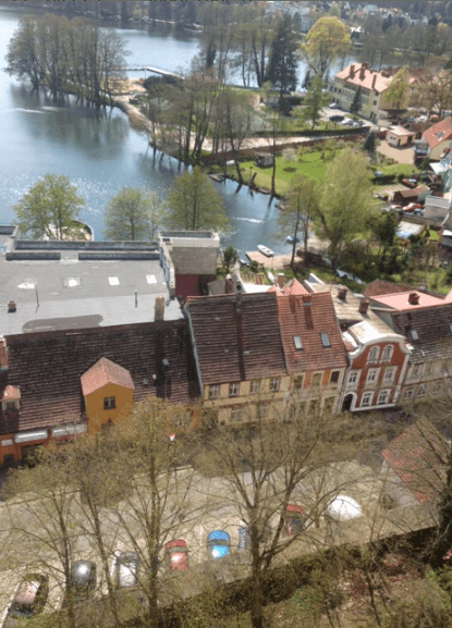 Urzekło nas to małe ,malowniczo położone miasteczko, z 1600 mieszkańcami, z zamkiem Joannitów, wieżą widokową , z której można podziwiać panoramę miasta i Łagowskiego Parku Krajobrazowego, a także dwa sensownie , z myślą o turystach, zagospodarowane jeziora: Trześniowskie i Łagowskie. W oddali zachwyca secesyjny wiadukt. To miasteczko – i słusznie – nosi dumną nazwę PERŁY WOJEWÓDZTWA LUBUSKIEGO. Aby móc to wszystko zobaczyć trzeba się było wspiąć najpierw na poziom wewnętrznego patio w pomieszczeniach kawiarniano – restauracyjnych (29 schodów), potem na wieżę – 135 schodów, sanitariaty były położone w dół od patio o 18 schodów. Po podsumowaniu, w samym Łagowie trzeba było pokonać 228 schodów, w Międzyrzeczu 320. Co daje sumę 548. Jakoś to poszło w miarę bezboleśnie! A poza tym humory dopisywały i nawet przelotne deszcze nie mogły zepsuć dobrego nastroju.