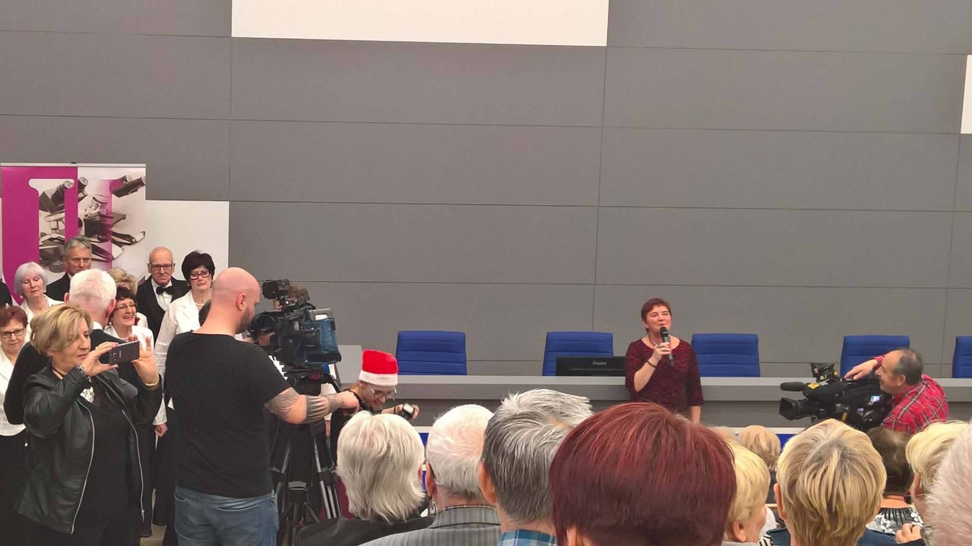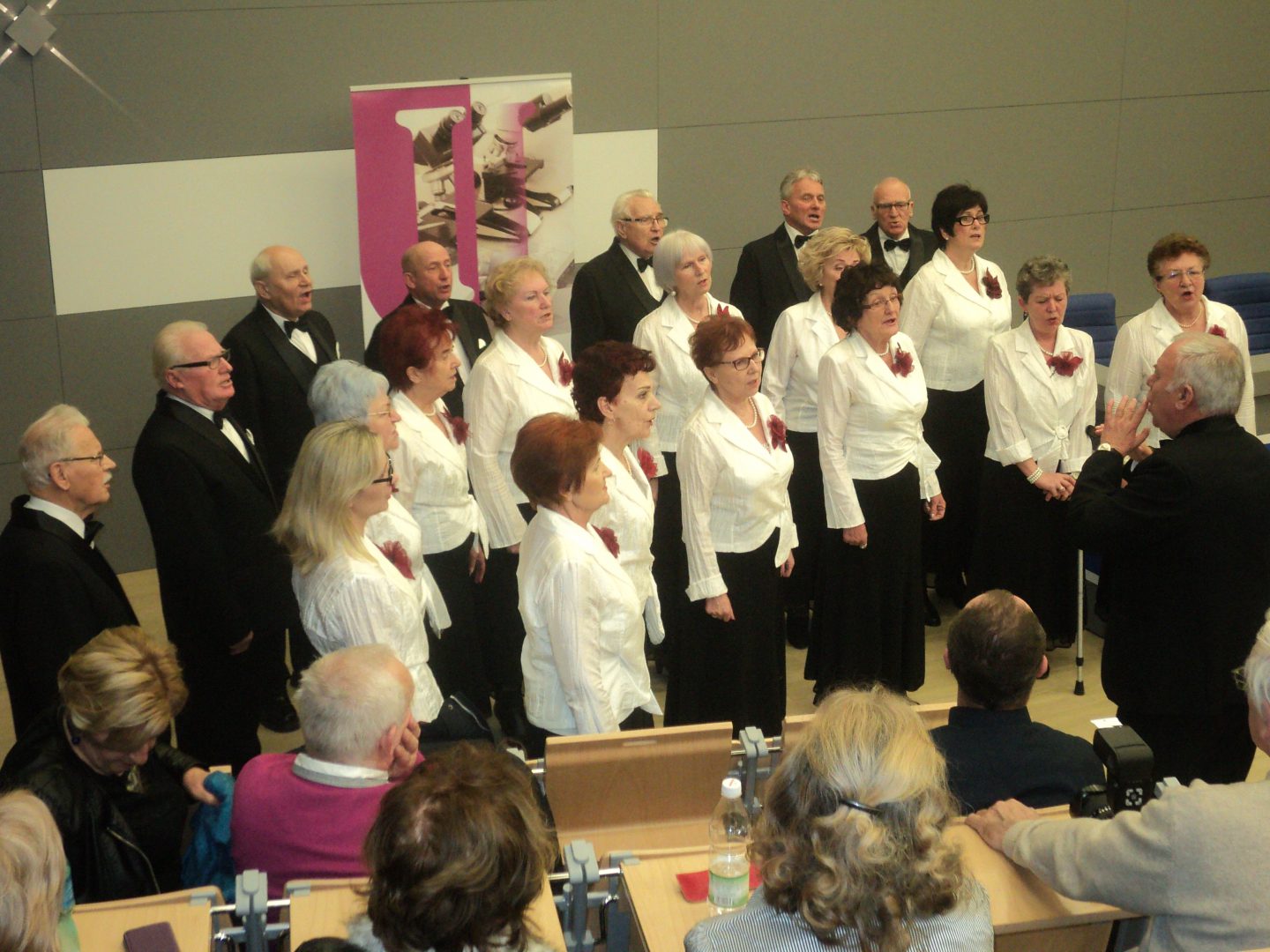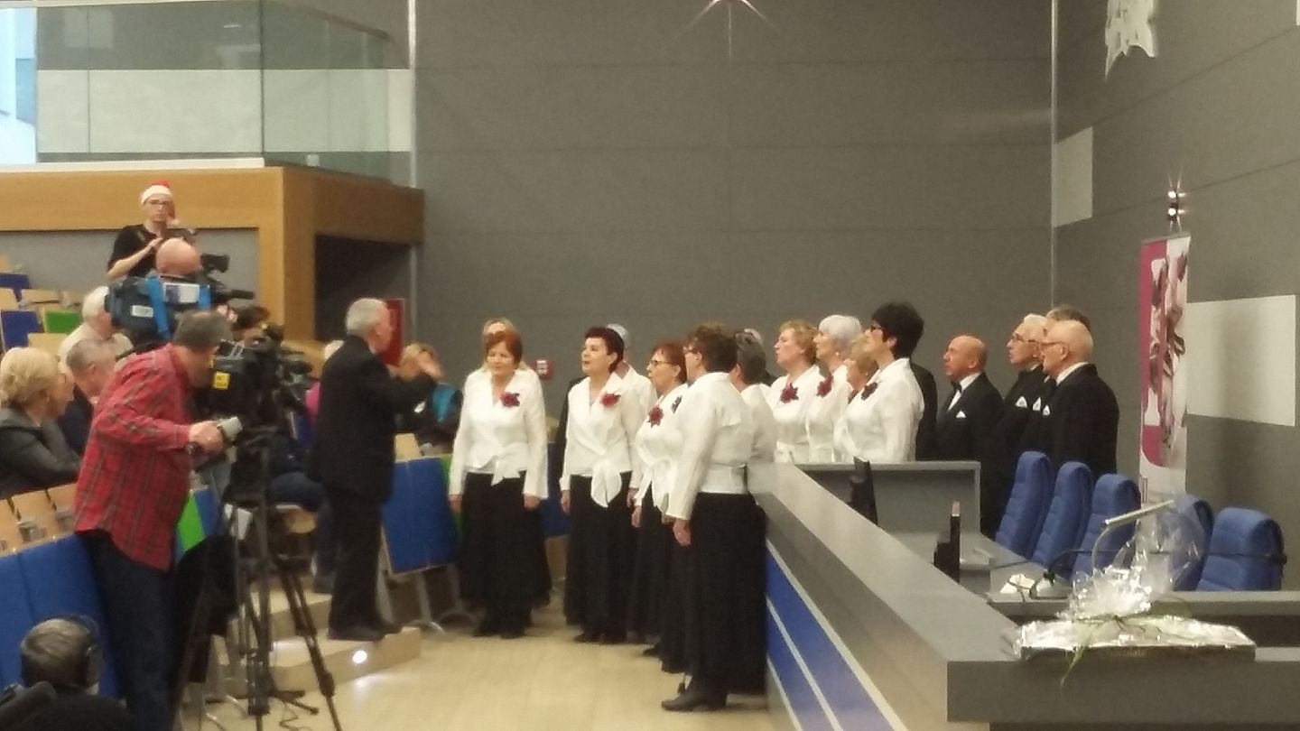 Kolejnym punktem uroczystości był koncert kolęd i pastorałek w wykonaniu zespołów śpiewaczych i chórów uniwersyteckich. Ach, to był wspaniały, nowatorski pomysł naszej kochanej Pani prof. Iwony Wiśniewskiej-Salamon. Nagrana została i prześlicznie edytorsko wydana płyta z kolędami i pastorałkami w wykonaniu śpiewających słuchaczy Uniwersytetów Trzeciego Wieku, solistów i zespołów. I właśnie ci wokaliści zaprezentowali swoje umiejętności na koncercie. Śpiewał również i nasz chór „Melodia”. Jak? Cóż: nie wypada się chwalić, ale po koncercie Dyrygent chóru Pan Bogdan Komorowski i wszyscy chórzyści zbierali mnóstwo gratulacji, wyrazów zachwytu i pochwał…