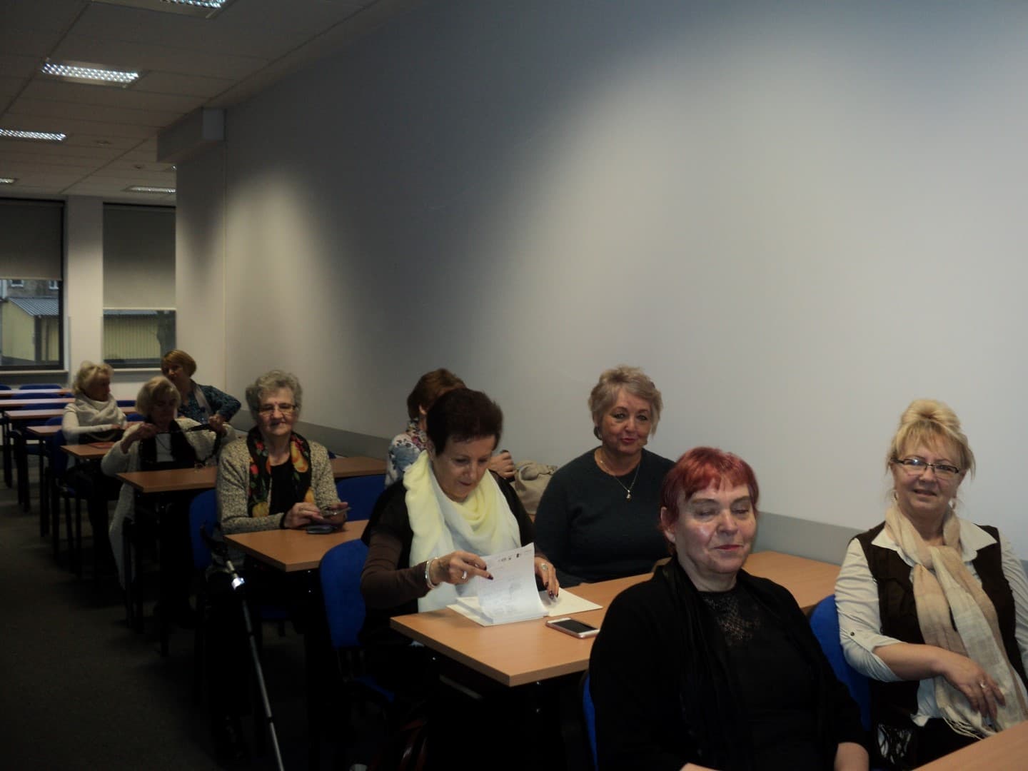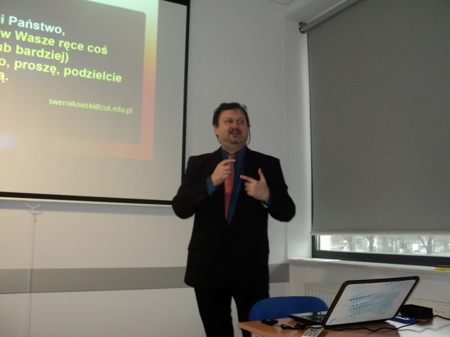 Nasi myśliborscy studenci mieli tego dnia jeszcze jeden, równie znakomity wykład, fantastycznie przeprowadzony przez p. mgr inż. Sławomira Wernikowskiego pt: „Jak nie dać się oszukać w Internecie”. Temat bardzo na czasie, jako że Internet z założenia – miał być ogólnoświatową biblioteką naukową otwartą dla ludzi dobrej woli – a stał się areną działań wszelkiej maści spryciarzy i naciągaczy. Są więc spamy – niechciane wiadomości, głównie reklamy, ale i scamy – spamy kryminalne, tzw. „konie trojańskie” przechwytujące wszystkie informacje o użytkownikach sieci. Naprawdę warto było posłuchać, jak się nie dać wykorzystać oszustom, jak zabezpieczyć swoje dane, hasła używane do logowania. Nasi gospodarze zadbali również o nasz dobrostan fizyczny, częstując nas w przerwie między wykładami gorącymi napojami i ciastkami. O tak, drodzy Państwo! To naprawdę fantastyczny projekt! Już dziś zapisuję się na wszystkie kolejne wyjazdy na zajęcia do Zachodniopomorskiego Technologicznego Uniwersytetu Trzeciego Wieku!