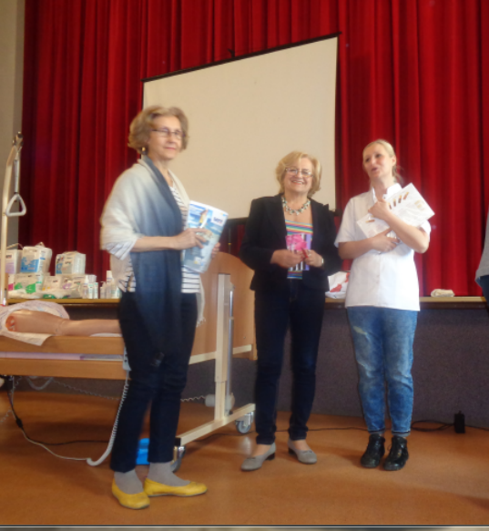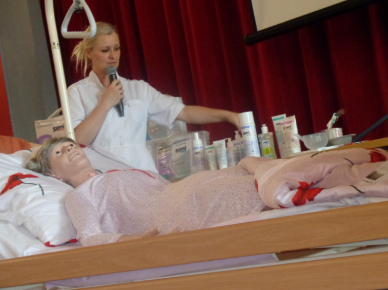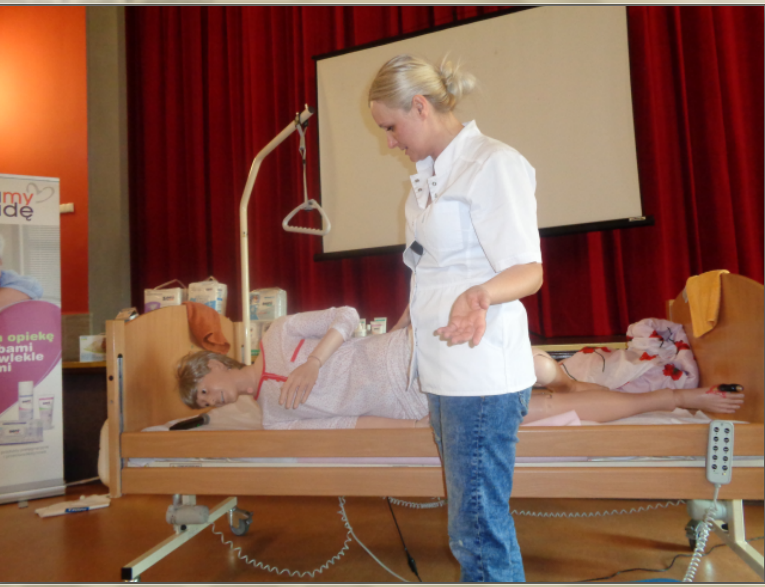 Pani Katarzyna przyjechała z całym bagażem,, pomocy naukowych”. Przywiozła specjalistyczne łóżko wraz z leżącym manekinem pieszczotliwie nazwanym Ewą, przywiozła także materac odleżynowy oraz bogaty zestaw kosmetyków do mycia, regeneracji i pielęgnacji ciała, wśród których znalazły się środki do profilaktyki i leczenia groźnych odleżyn.