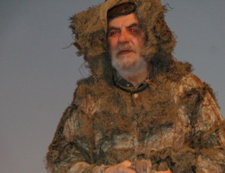 Zaskoczył strojem – nikt z nas nigdy nie widział z bliska maskującego stroju fotografa – przyrodnika. A tu masz… fotograf pokazał się w pełnej krasie.