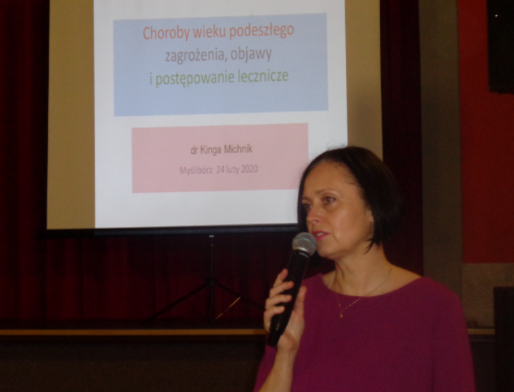 Wykład dr KINGI MICHNIK to jakby dwa oblicza jednego medalu. Po jednej ze stron chyba potrzebna, niemal drobiazgowa wiedza na temat zagrożeń czyhających na starszych ludzi przekazana przez fachowca, a z drugiej strony silny lęk słuchaczy, połączony ze stresem i tykająca w głowie myśl …, kiedy to właśnie mnie dotknie jedna z tych strasznych dolegliwości. Co wtedy? Gdzie szukać dawnego siebie z dawną energią, z dawnymi chęciami , a przede wszystkim z dawnym, nieco nadszarpniętym wiekiem, ale zawsze – zdrowiem. Po wielu wykładach sporo wiemy o geriatrii, wiemy także o smutnej statystyce starszych ludzi przybywa, geriatrów NIE!