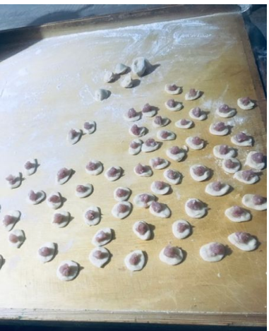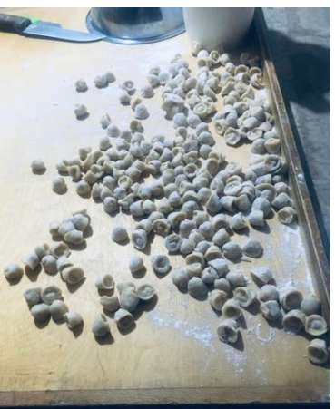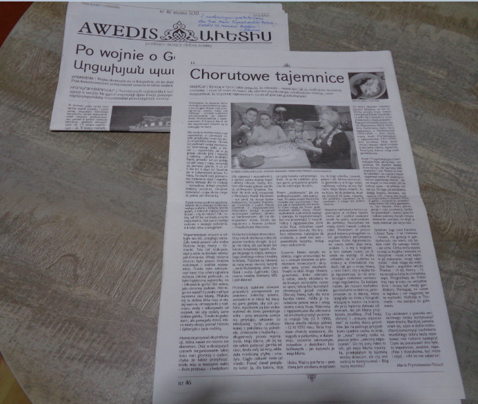 Zaprosiłam koleżanki i pana Pawła do siebie na ormiańskie gandżabury. Jest to zupa z małymi uszkami z farszem mięsnym (kilka godzin pracy), zagotowana na zabielanym rosole z trzech gatunków mięs i doprawiona chorutem – przyprawą wybitnie pracochłonną, której przygotowanie trwa nawet do tygodnia, a którą, od kiedy umarła moja Mama, robię własnoręcznie – doceniając pomoc osobistego męża Antoniego . Cały proces przygotowania chorutu i gandżaburów, oraz rodzinne wspomnienia sprzed lat zamieściłam w kwietniu 2021 roku w obszernym artykule w polsko – ormiańskim kwartalniku AVEDIS, który ,,idzie” na całą Polskę.