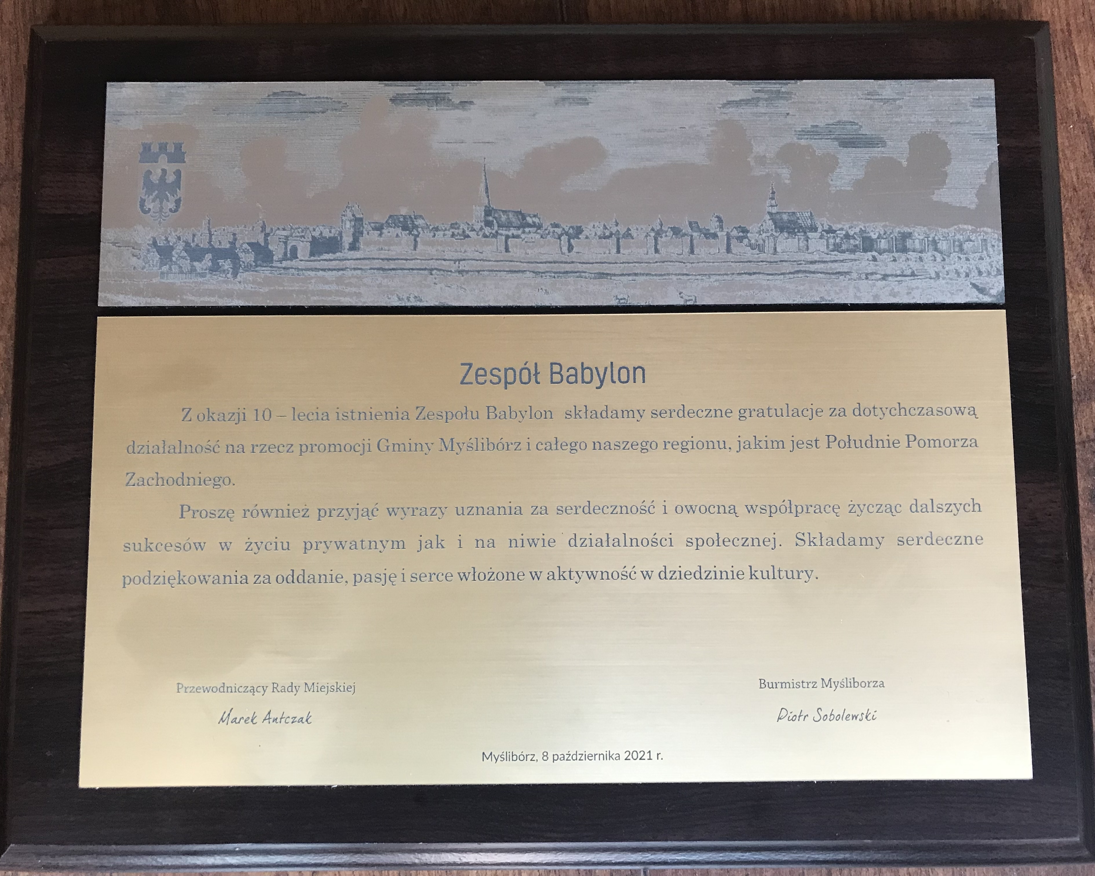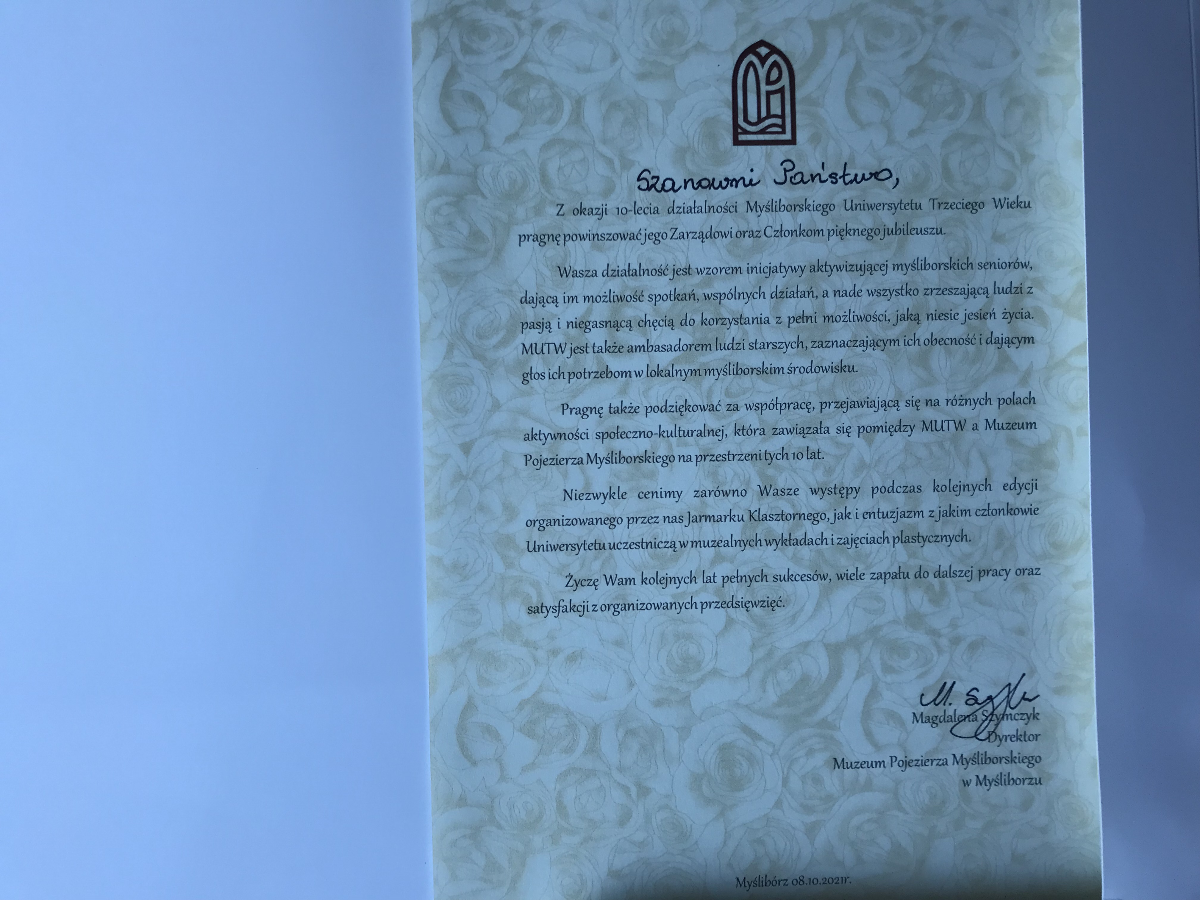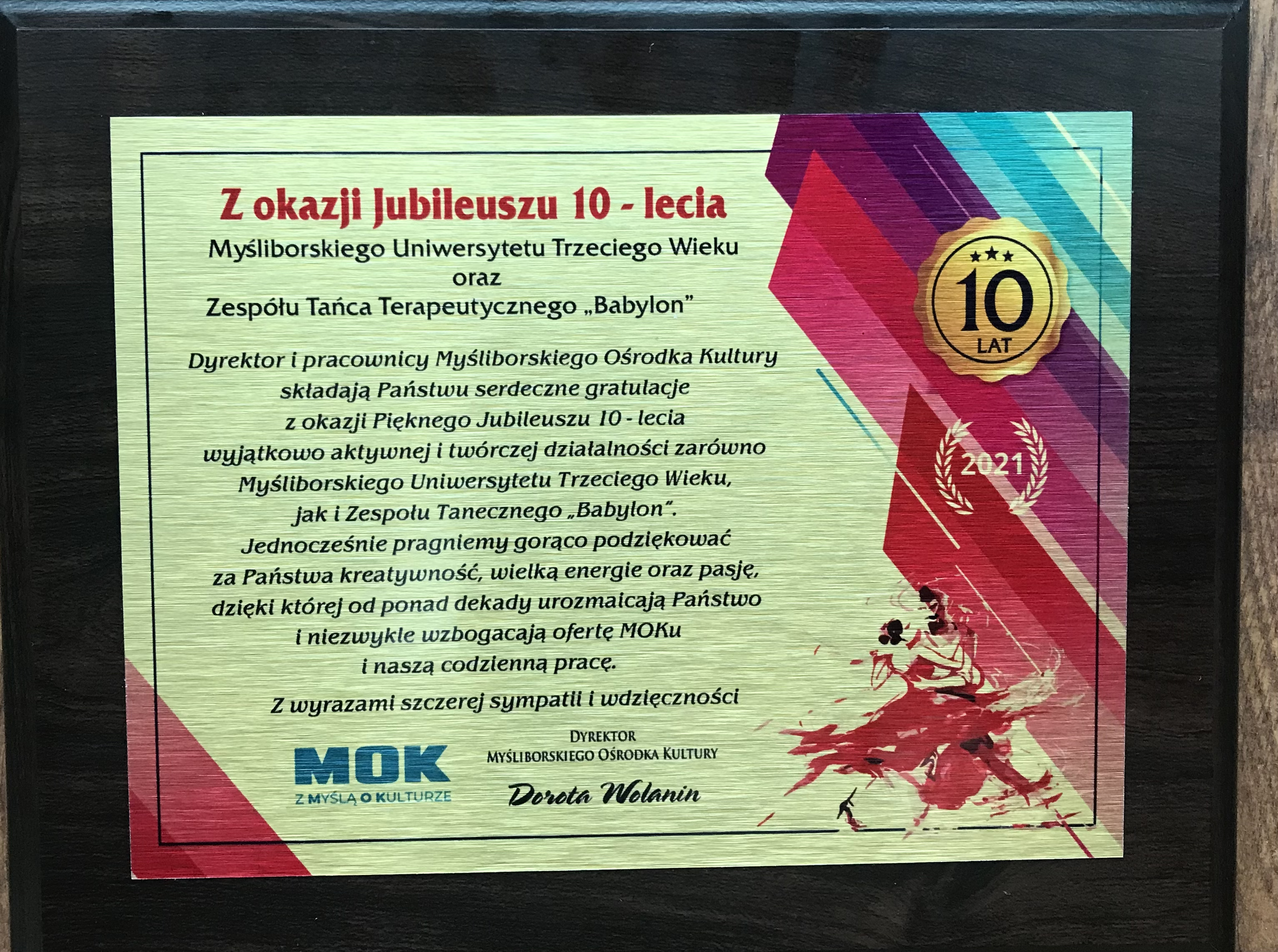 W imieniu własnym, MUTW i Zespołu Tańca Terapeutycznego ,,BABYLON” przesyłam serdeczne podziękowania dla Burmistrza Myśliborza Piotra Sobolewskiego, Przewodniczącego Rady Miasta Marka Antczaka i Janiny Sulejewskiej Naczelnik Wydziału Edukacji i Spraw Organizacyjnych za życzenia, kwiaty i piękną nagrodę – czek na 2000 zł.