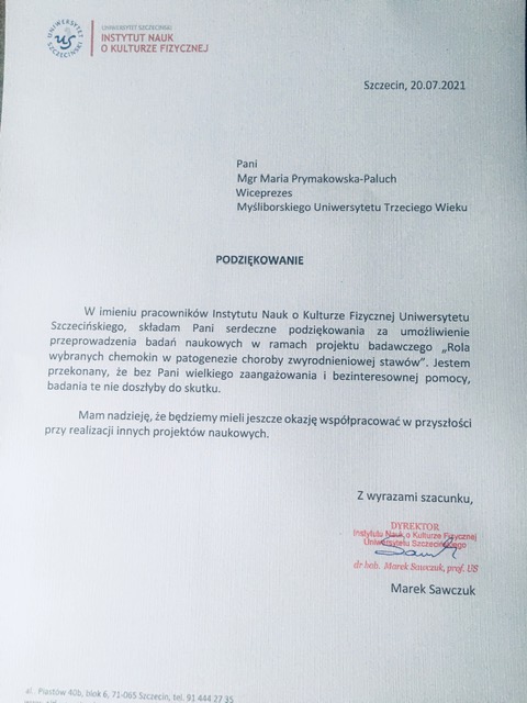 pragnę podziękować Władzom MUTW za dotychczasową współpracę a szczególnie Pani wiceprezes Marii Prymakowskiej-Paluch za okazaną pomoc w organizacji badań naukowych w Państwa środowisku senioralnym w dniu 20.07.2021r.oraz zaproszenie na wspólny i niezapomniany wyjazd do Kołobrzegu (28.07.2021r.). Mam nadzieję, że planowane dalsze badania będą kontynuowane przy Państwa udziale w Centrum Badań Strukturalno-Funkcjonalnych Człowieka Instytutu Nauk o Kulturze Fizycznej Uniwersytetu Szczecińskiego przy akceptacji Dyrektora INoKF dra hab. Marka Sawczuka, prof.US.