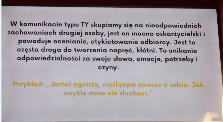 – Nie udawajmy i nie oszukujmy, że nie rozmawiamy sami ze sobą – powiedziała wykładowczyni pani KLAUDIA PIOTROWSKA – każdy ma coś sobie do powiedzenia ,czasem ,,do słuchu” , czasem coś miłego, ważne jest jednak to, aby w obu przypadkach siebie lubić , akceptować, traktować z szacunkiem i nie zapominać o asertywności. Dajemy tym samym jasny przekaz jak chcemy być traktowani przez innych.