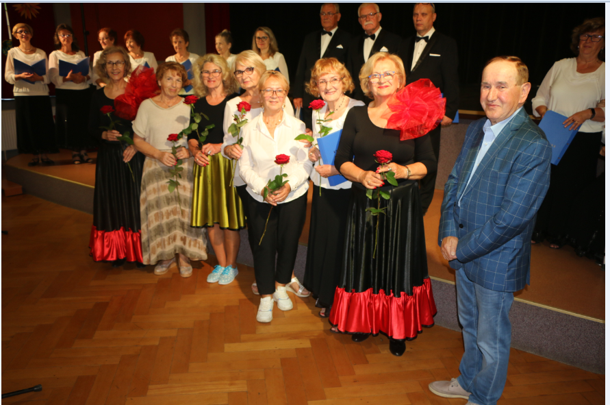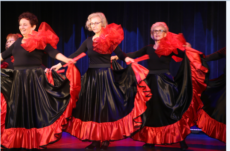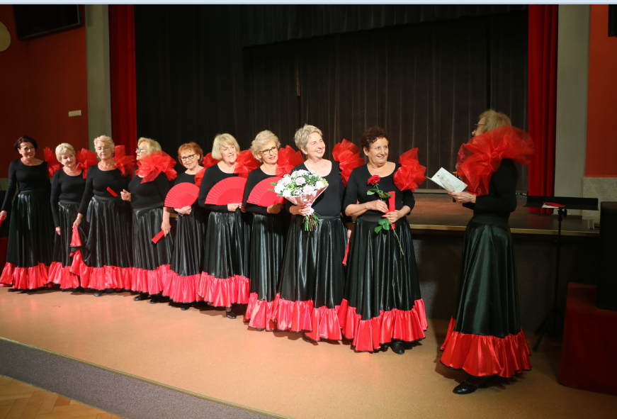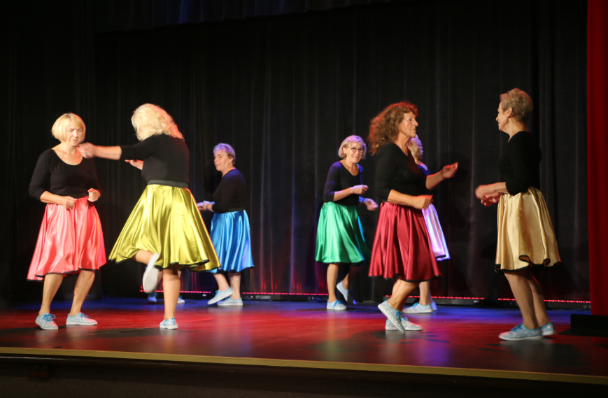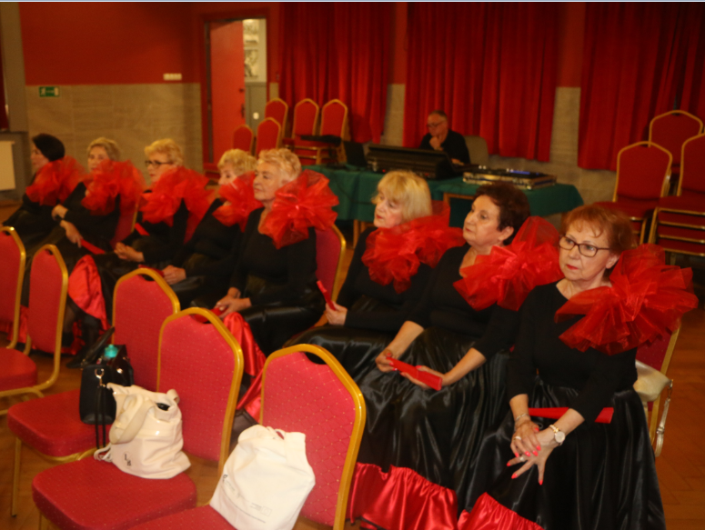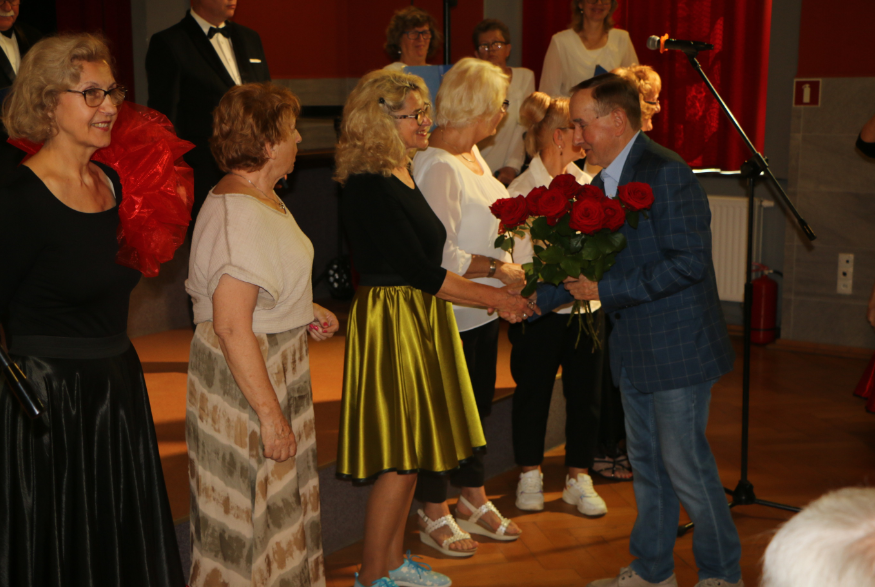 Krótką część artystyczną rozpoczął żywiołowy rock and roll ,,Szalone niebieskie buciki”, który – na scenie – przedstawił zespół gimnastyczno – taneczny MyśliDorki prowadzony przez DOROTĘ LASTOWSKĄ – CHOŁOCIŃSKĄ. Widać, że naszym koleżankom werwy nie brakuje, a taniec zatrzymał przy nich na dłużej młodość i radość życia! Stroje też was odmłodziły!