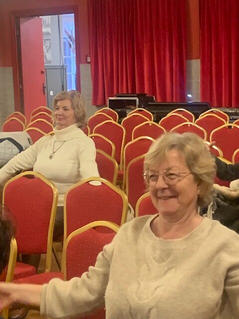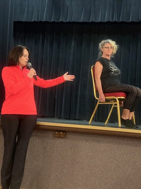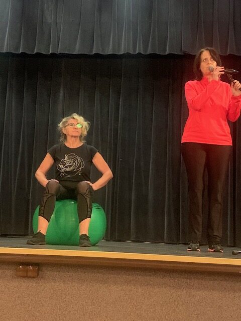 Prawidłowa postawa ciała przy siedzeniu to przede wszystkim stopy oparte na podłodze i to równolegle do siebie, wirtualny palec między łopatkami, który prostuje nasze plecy, naturalne obniżenie ramion, głowa z lekko przyciągniętą brodą do szyi i napięcie pośladków – ćwiczyliśmy to i nie tylko to, na spotkaniu