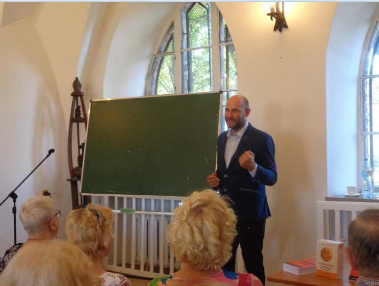 Pan JACEK ŁAPIŃSKI – pisarz, prawnik, przedsiębiorca, człowiek wielu pasji, mors tryskający energią i humorem, człowiek otwarty, naładowany – mimo młodego wieku – życiowym doświadczeniem starał się nam przekazać wypracowane i sprawdzone przez siebie mądrości dotyczące uśmiechu i szeroko pojętego rozwoju osobistego.