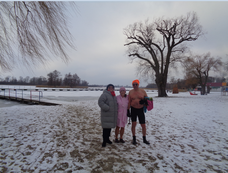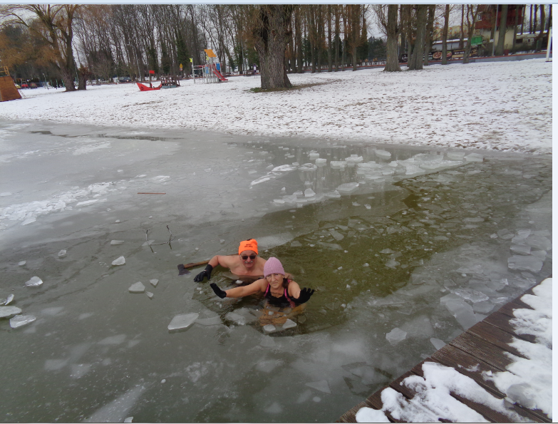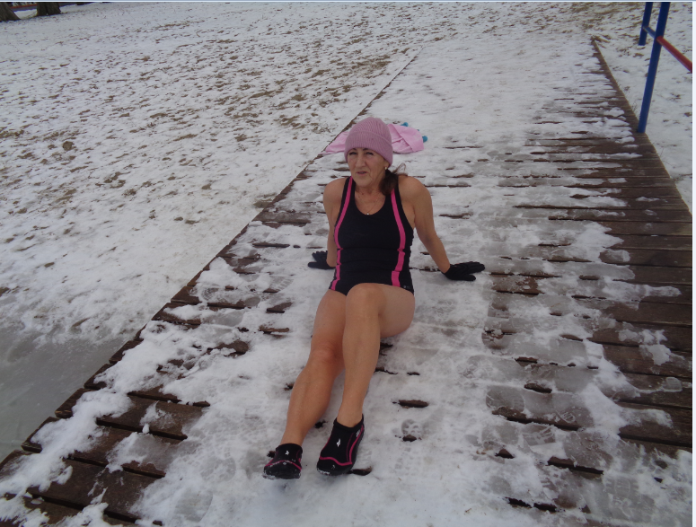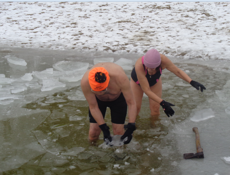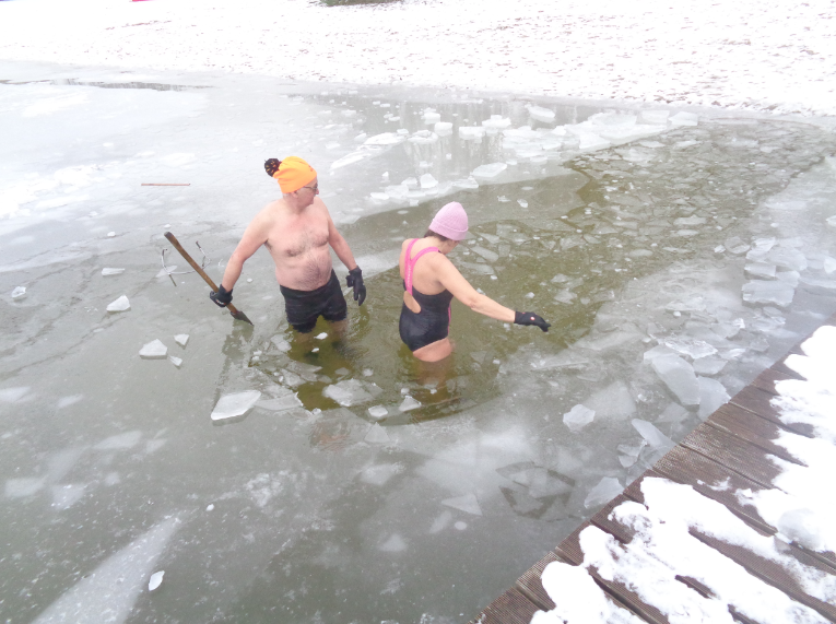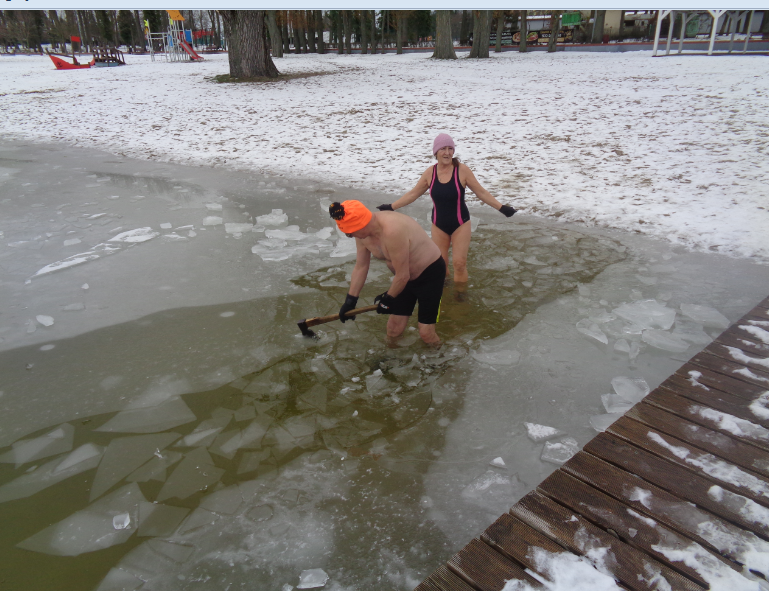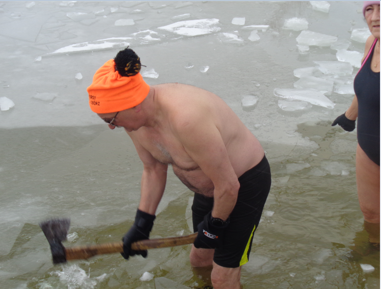 Nie wolno bez rozgrzewki i samemu, ze względu na bezpieczeństwo, wchodzić do lodowatej wody. Ula była w towarzystwie pana ANDRZEJA, który, w lodzie, siekierą wyrąbał drogę do głębszej wody. Co widziałam, udokumentowałam i pokazuję innym.