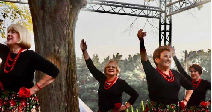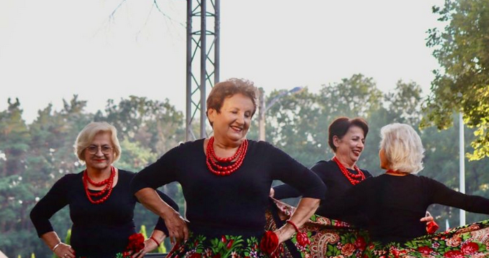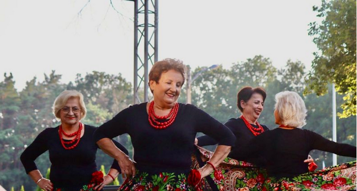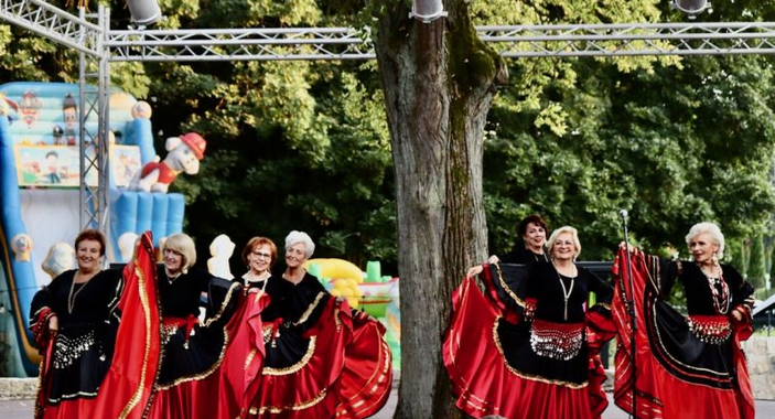 Wydarzenie ,,OBLICZA RÓŻNORODNOŚCI” obfitowało w folklor, śpiew i taniec. Nasz zespół zaprezentował swoje 4 układy taneczne, bardzo dobrze przyjęte przez zgromadzoną publiczność i profesjonalnych wykonawców. Niech nie będzie mi poczytane za nietakt, jeśli krótko napomknę o niesprzyjających okolicznościach, których doświadczyłyśmy, a których nie sposób było przeskoczyć. Jedną z nich był dokuczliwy wprost upał, drugą niespotykaną dotąd przez nas sytuacją była scena do tańców … z dorodną lipą w środku. Daliśmy radę – teraz już nic nie jest w stanie nas zaskoczyć.