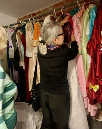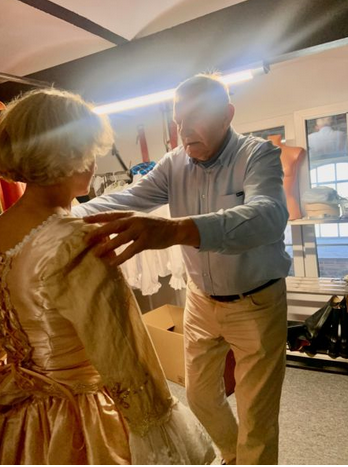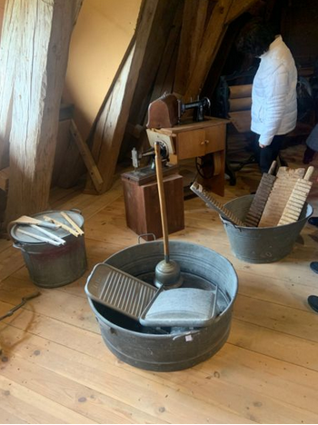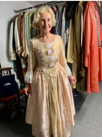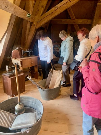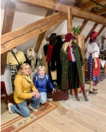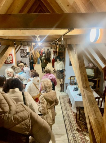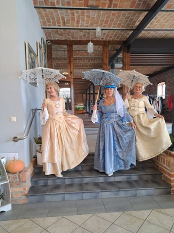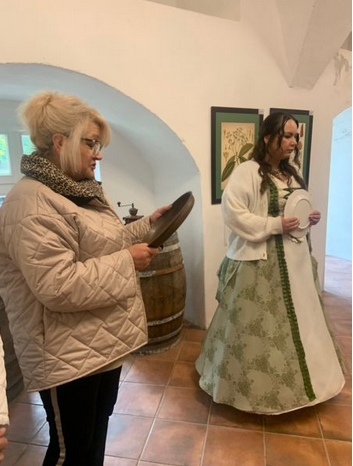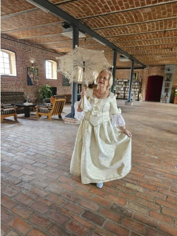 Stworzona została także okazja do przebrania się, niestety tylko dla 3 osób, w stroje z epoki. Dostąpiłam tego zaszczytu i na moment przeniosłam się ,z koleżankami, w XVIII wiek. Nie ma czego zazdrościć tamtejszym damom – stroje są przepiękne, ale mało wygodne. Pani przewodniczka,  MAGDA, odczytała nam w muzealnych wnętrzach przykładowy spis kilkunastu wykwintnych potraw jakimi się raczono podczas  jednego z przykładowych obiadów  w pałacu  – trudno pojąć, jak przy takiej bogatej ofercie obiadowej, damom udawało się  zachować wiotką kibić i niską wagę ciała. Wiem, że  sznurowane gorsety tuszowały nadmiar tego i owego, ale w moim przypadku upychanie ,,nadmiarów” przez pana Z. tylko nieco pomogło. Zaznaczam, że nie czuję się za gruba. No może … troszeczkę.