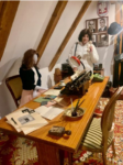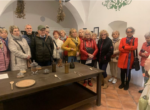 Stworzona została także okazja do przebrania się, niestety tylko dla 3 osób, w stroje z epoki. Dostąpiłam tego zaszczytu i na moment przeniosłam się ,z koleżankami, w XVIII wiek. Nie ma czego zazdrościć tamtejszym damom – stroje są przepiękne, ale mało wygodne. Pani przewodniczka, MAGDA, odczytała nam w muzealnych wnętrzach przykładowy spis kilkunastu wykwintnych potraw jakimi się raczono podczas jednego z przykładowych obiadów w pałacu – trudno pojąć, jak przy takiej bogatej ofercie obiadowej, damom udawało się zachować wiotką kibić i niską wagę ciała. Wiem, że sznurowane gorsety tuszowały nadmiar tego i owego, ale w moim przypadku upychanie ,,nadmiarów” przez pana Z. tylko nieco pomogło. Zaznaczam, że nie czuję się za gruba. No może … troszeczkę.