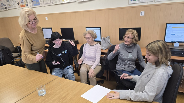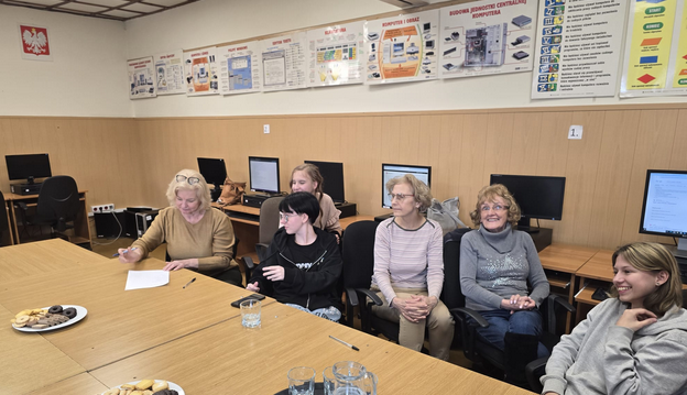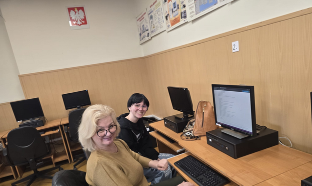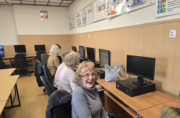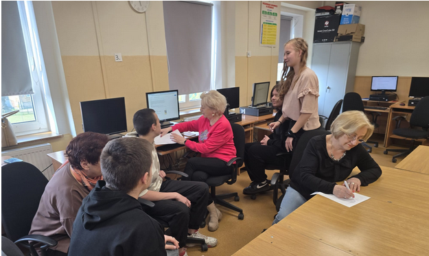 Zajęcia w ciekawy sposób, prowadzi mentorka i koordynator projektu – NICOL SWEET dbająca o to, żeby przekazywane informacje były zrozumiałe dla ,,starszej młodzieży”. Jasne, że nie od razu ,chwytamy”. Mija parę chwil zanim się w głowie wszystko poukłada, a ręce przeniosą fakty na ekran. Z ufnością i bez strachu poddajemy się nowościom, bo obok nas siedzi i czuwa młody człowiek, uczeń pani NICOL, traktowany przez nas jak dobry duch i dobry wnuczek.