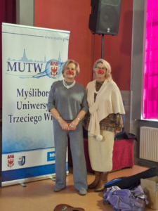 Zaprosić na wykład do nas, do MYŚLIBORSKIEGO UNIWERSYTETU TRZECIEGO WIEKU, przedstawiciela CZERWONYCH NOSKÓW do łatwych nie należało. Poruszyłam trochę nieba, trochę ziemi, parę osób, których nigdy nie widziałam np. panią KASIĘ KORDZIAK z Warszawy, parę osób, które znam od dawna, tak jak LUCYNĘ i PAWŁA KLUKOWSKICH z Wrocławia, aż w końcu dotarłam do JOANNY LEWANDOWSKIEJ – kobiety z temperamentem, utalentowanej, uśmiechniętej, przemiłej, bardzo ładnej, czerwono noskowej pani z Ińska.